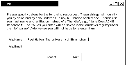 I have recently (a couple of days ago) installed the Access Grid toolkit 2.2 on a windows 2000 and a windows XP machine. vic on both machines prompt me for an email address every time I go into a venue (I've only tried the default venue so far) as in the attached screen grab. Despite what it says, I don't have any Software\Vic entry in the registry on either machine. In both cases this is when logged on as administrator. If I go into the venue as a non-administrator user it doesn't pick up the rtpName, so this seems to be stored somewhere that is only readable (let alone writeable) by administrator.