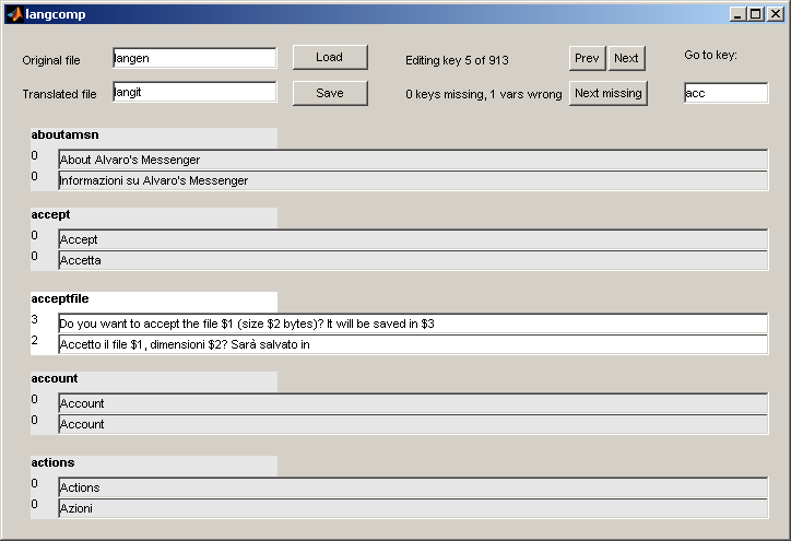 Hi everybody! I have written a small program called langcomp, that shows each translated key together with the original, and checks the number of $n variables it is written in MATLAB the big problem is that I can't set the encoding, I think it users the system default, does anybody know? also I'm only able to compile it for windows