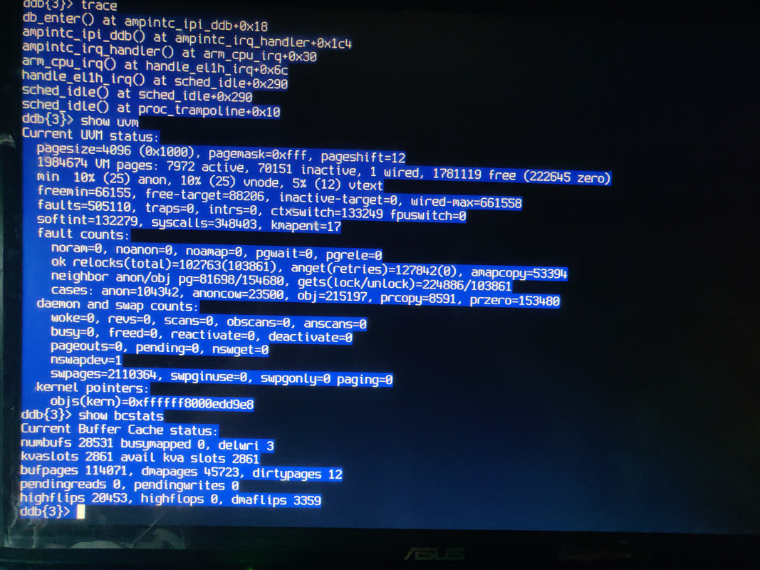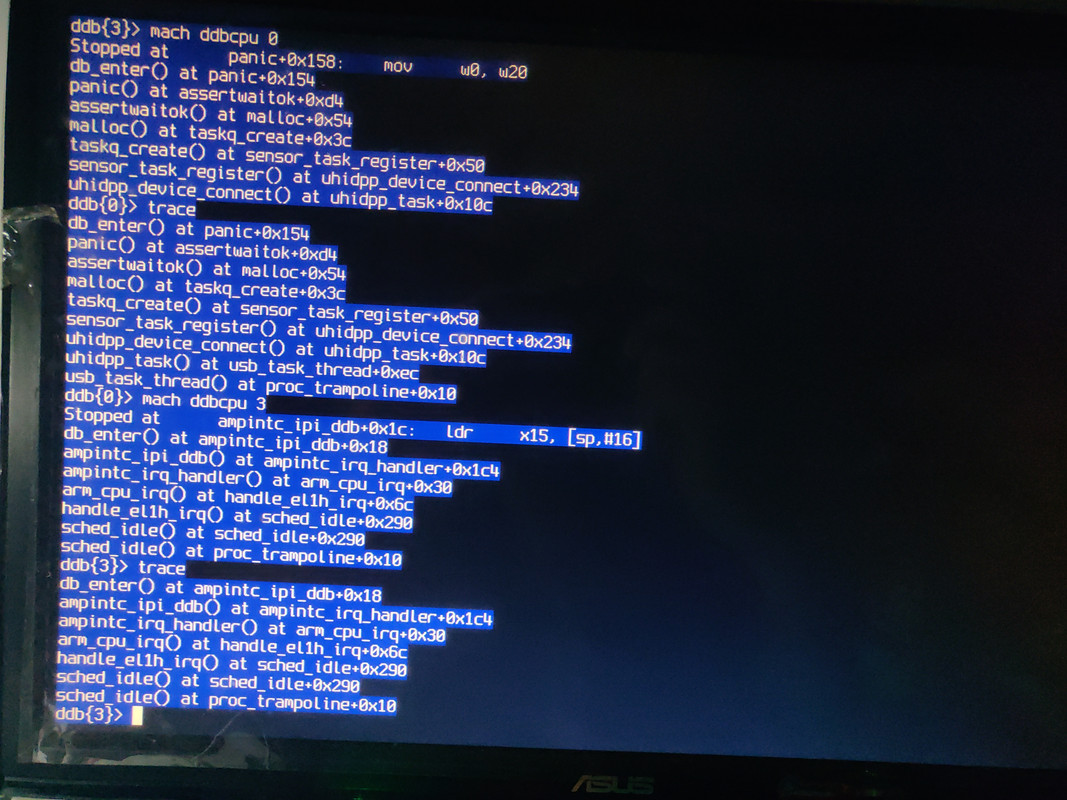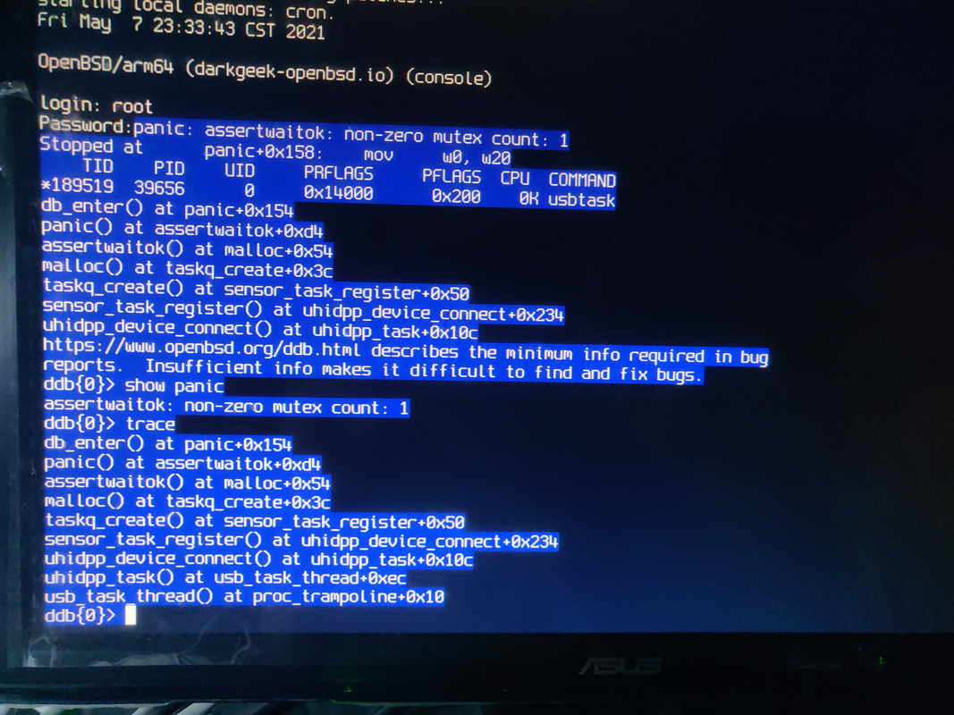 Justin, you can probably bypass this for now if you "boot -c" at the bootloader prompt and "disable uhidpp". If that works you can modify an on-disk kernel to disable it with config(8) -ef. Trace roughly transcribed from the first photo. (It's always easier to have text rather than photos). panic: assertwaitok: non-zero mutex count: 1, active process usbtask assertwaitok at malloc malloc at taskq_create+0x3c taskq_create at sensor_task_register+0x50 sensor_task_register at uhidpp_device_connect+0x234 uhidpp_device_connect at uhidpp_task+0x10c ----- Forwarded message from Justin Yang <[email protected]> ----- From: Justin Yang <[email protected]> Date: Fri, 7 May 2021 23:58:02 +0800 To: Stuart Henderson <[email protected]> Cc: Mark Kettenis <[email protected]>, "[email protected]" <[email protected]> Subject: Re: Raspberry Pi 4B randomly kernel panics after upgrading to 6.9 I found that my previous mail was still incomplete, so I reinstalled the whole system, and captured again: https://i.postimg.cc/jjrd07xZ/2021-05-07-23-38-49.jpg https://i.postimg.cc/qRq8nYPt/2021-05-07-23-40-09.jpg https://i.postimg.cc/9QM2TYx4/2021-05-07-23-41-45.jpg https://i.postimg.cc/N0kxcRc4/2021-05-07-23-42-53.jpg https://i.postimg.cc/FKkf4LJ6/2021-05-07-23-43-18.jpg https://i.postimg.cc/VLTmcHBY/2021-05-07-23-45-34.jpg On Friday, May 7, 2021, Justin Yang <[email protected]> wrote: > OK, I captured the trace and ddbcpu output: > > https://i.postimg.cc/hGcQfznj/2021-05-07-20-37-56.jpg > https://i.postimg.cc/nz54W4jz/2021-05-07-20-38-56.jpg > > On Friday, May 7, 2021, Stuart Henderson <[email protected]> wrote: > >> At least "trace" from ddb is required. >> >> -- >> Sent from a phone, apologies for poor formatting. >> >> On 6 May 2021 15:21:25 Justin Yang <[email protected]> wrote: >> >> Hi, >>> Sorry for the late reply. Here are the dmesg links for both 6.8 and 6.9: >>> >>> 6.8: >>> https://dmesgd.nycbug.org/index.cgi?do=view&id=5924 >>> >>> 6.9: >>> https://dmesgd.nycbug.org/index.cgi?do=view&id=6067 >>> >>> and some ddb output: >>> https://i.postimg.cc/tTWPLzCB/2021-05-06-21-42-54.jpg >>> >>> On Sat, May 1, 2021 at 9:57 PM Mark Kettenis <[email protected]> >>> wrote: >>> >>> From: Justin Yang <[email protected]> >>>>> Date: Sat, 1 May 2021 21:15:31 +0800 >>>>> >>>>> Hi, >>>>> >>>>> I have a Raspberry Pi 4B (8G mem) with OpenBSD 6.8 installed on a USB 3 >>>>> disk drive, and with edk2 firmware v1.22 flashed on SD card. It works >>>>> >>>> fine >>>> >>>>> untill I upgrade to 6.9 Release by 'sysupgrade' today. After this >>>>> upgrading, the system becomes unstable and crashes randomly and says: >>>>> >>>>> panic: assertwaitok: non-zero mutex count: 1 >>>>> >>>>> The screenshot can be viewed here: https://ibb.co/K6N1DdM >>>>> >>>>> Then I flashed edk2 firmware v1.21 to SD card just now, and booted it >>>>> again, but still, it didn't work and crashed as before. I can confirm >>>>> there's not such issue in 6.8. Am I missing something or is this a bug? >>>>> >>>> >>>> Please post the full dmesg of both the 6.8 and the 6.9 kernel. And if >>>> the panic happens again, follow the instructions pointed at on your >>>> screen. >>>> >>>> >>> >>> -- >>> Justin Yang >>> >> >> > > -- > Justin Yang > > -- Justin Yang ----- End forwarded message -----
