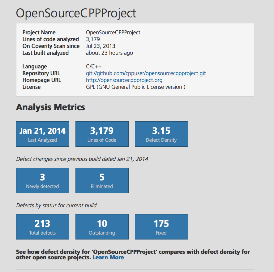 You can find our project on Coverity here: https://scan.coverity.com/projects/9?tab=Overview They recently changed their policy and now anyone can become a Project Observer without being invited by or approved by anyone. So, feel free to register as project observer! Coverity keeps track of lines of code, defects, and so on and you can see it all there - including a history of past defects, and provide a defect density comparison to other open source projects. Another site which might be of interest is Ohloh. The project's Ohloh page can be found here: http://www.ohloh.net/p/assimmon This site has a graph of lines of code over time and some other statistics. Let me know if you have any questions... -------- Original Message -------- Subject: Notification of change in the Coverity Scan service Date: Thu, 23 Jan 2014 13:15:11 -0800 From: [email protected] To: [email protected] Dear Scan Project Maintainer, Thank you for your continued support of the Coverity Scan service. Numerous project maintainers have been inundated with requests from individuals who are not contributing to the project but simply want to view it. After discussion with some of you, and to ease this burden, we have added a new Project Observer role. Project Observers be able to view high level data about individual projects including the count of outstanding defects, fixed defects and defect density. Preview of high level data availalbe to Project Observer https://scan.coverity.com/project_summary.png They will not be able to view actual defects or make changes to the project. Unless you choose to opt out, Project Observer requests will automatically be approved. If decide to opt out, you will still be able to grant observer rights to specific individuals. To opt out, you will need to complete the following steps by February 7th: 1. Click on http://scan.coverity.com/projects/9?tab=Project+Settings 2. Sign-in to Coverity Scan, if you are prompted to sign-in. 3. Click on "Edit" and choose "Access to Project summary requires approval from Project Maintainer". Please contact me if you have any questions or concerns about this program. Regards, Dakshesh Vyas Coverity Scan Administrator Coverity | 185 Berry Street | Suite 6500, Lobby 3 | San Francisco, CA 94107 Office: 415.935.2957 | [email protected] http://scan.coverity.com/ The Leader in Development Testing