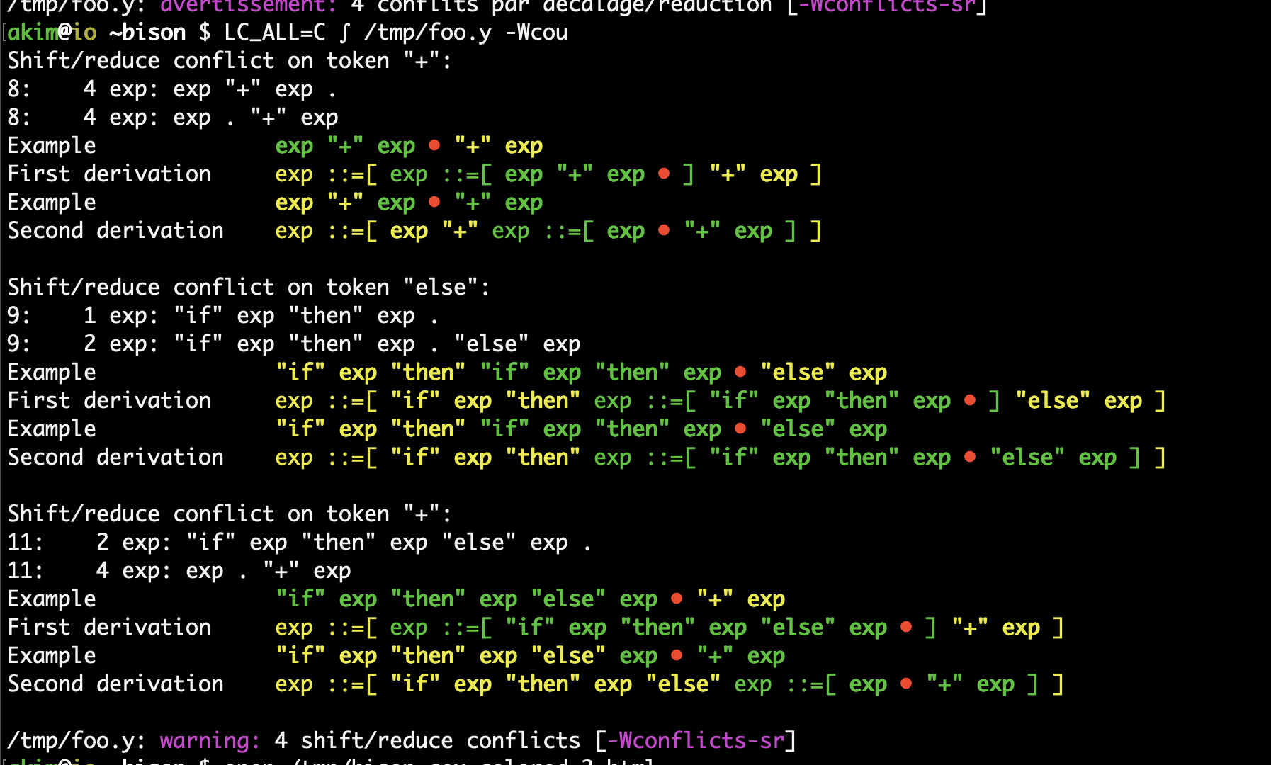 This is only a proposal. I'll install it unless there is resistance in the near future, but I'm open with changing things afterwards. This is what I get on the dangling else example: https://www.lrde.epita.fr/~akim/private/bison/bison-cex-color-2.png Instead of alternating the examples and derivations (keep in mind this is colored, see the URL above): > Example "if" exp "then" exp "else" exp • "+" exp > First derivation exp ::=[ exp ::=[ "if" exp "then" exp "else" exp • ] "+" > exp ] > Example "if" exp "then" exp "else" exp • "+" exp > Second derivation exp ::=[ "if" exp "then" exp "else" exp ::=[ exp • "+" > exp ] ] maybe we should put both examples one after the other, two make it easier to catch the differences, > First derivation exp ::=[ exp ::=[ "if" exp "then" exp "else" exp • ] "+" > exp ] > Example "if" exp "then" exp "else" exp • "+" exp > Example "if" exp "then" exp "else" exp • "+" exp > Second derivation exp ::=[ "if" exp "then" exp "else" exp ::=[ exp • "+" > exp ] ] or both derivations, > Example "if" exp "then" exp "else" exp • "+" expFirst derivation > exp ::=[ exp ::=[ "if" exp "then" exp "else" exp • ] "+" exp ] > Second derivation exp ::=[ "if" exp "then" exp "else" exp ::=[ exp • "+" > exp ] ] > Example "if" exp "then" exp "else" exp • "+" exp or both bothes: > Example "if" exp "then" exp "else" exp • "+" exp > Example "if" exp "then" exp "else" exp • "+" exp > First derivation exp ::=[ exp ::=[ "if" exp "then" exp "else" exp • ] "+" > exp ] > Second derivation exp ::=[ "if" exp "then" exp "else" exp ::=[ exp • "+" > exp ] ] commit d5f2063d51b30e2c5571301e771dea63f10889cc Author: Akim Demaille <[email protected]> Date: Sat May 23 19:13:01 2020 +0200 cex: color the counterexamples Use colors to show the counterexamples and the derivations in color, to highlight their structure. Align the outputs, and add i18n support. Reduce width by using a one-space separator instead of two-space. From Example A • B C First derivation s ::=[ a ::=[ A • ] x ::=[ B C ] ] Second derivation s ::=[ y ::=[ A • B ] c ::=[ C ] ] to Example A • B C First derivation s ::=[ a ::=[ A • ] x ::=[ B C ] ] Example A • B C Second derivation s ::=[ y ::=[ A • B ] c ::=[ C ] ] with colors. * data/bison-default.css (cex-dot, cex-0, cex-1, cex-2, cex-3, cex-4) (cex-5, cex-6, cex-7, cex-step, cex-leaf): New. * src/derivation.c (derivation_print_styled_impl): New. (derivation_print, derivation_print_leaves): Use it. * src/counterexample.c: Reformat the output. * tests/counterexample.at: Adjust. diff --git a/data/bison-default.css b/data/bison-default.css index 17b9b657..2652e03f 100644 --- a/data/bison-default.css +++ b/data/bison-default.css @@ -30,5 +30,28 @@ /* "Sections" in traces (--trace). */ .trace0 { color: green; } +/* Syntax error messages. */ .expected { color: green; } .unexpected { color: red; } + + +/* Counterexamples. */ + +/* Cex: point in rule. */ +.cex-dot { color: red; } + +/* Cex: coloring various rules. */ +.cex-0 { color: yellow; } +.cex-1 { color: green; } +.cex-2 { color: blue; } +.cex-3 { color: cobalt; } +.cex-4 { color: violet; } +.cex-5 { color: orange; } +.cex-6 { color: brown; } +.cex-7 { color: mauve; } + +/* Cex: derivation rewriting steps. */ +.cex-step { font-style: italic; } + +/* Cex: leaves of a derivation. */ +.cex-leaf { font-weight: 600; } diff --git a/src/counterexample.c b/src/counterexample.c index ebef6d5d..5b6c1d36 100644 --- a/src/counterexample.c +++ b/src/counterexample.c @@ -103,21 +103,18 @@ static void print_counterexample (counterexample *cex) { FILE *out = stderr; - if (cex->unifying) - fprintf (out, "Example "); - else - fprintf (out, "First Example "); + + fprintf (out, "%-20s ", cex->unifying ? _("Example") : _("First example")); derivation_print_leaves (cex->d1, out); - fprintf (out, "\nFirst derivation "); + fprintf (out, "%-20s ", _("First derivation")); derivation_print (cex->d1, out); - if (!cex->unifying) - { - fprintf (out, "\nSecond Example "); - derivation_print_leaves (cex->d2, out); - } - fprintf (out, "\nSecond derivation "); + + fprintf (out, "%-20s ", cex->unifying ? _("Example") : _("Second example")); + derivation_print_leaves (cex->d2, out); + fprintf (out, "%-20s ", _("Second derivation")); derivation_print (cex->d2, out); - fputs ("\n\n", out); + + fputc ('\n', out); } /* diff --git a/src/derivation.c b/src/derivation.c index 2f6a81e5..cc5145e5 100644 --- a/src/derivation.c +++ b/src/derivation.c @@ -18,11 +18,13 @@ along with this program. If not, see <http://www.gnu.org/licenses/>. */ #include <config.h> + +#include "derivation.h" + #include <gl_linked_list.h> #include "system.h" - -#include "derivation.h" +#include "complain.h" struct derivation { @@ -124,57 +126,72 @@ derivation_size (const derivation *deriv) return size; } -// these are used rarely enough that I don't think they should be interned. -void -derivation_print (const derivation *deriv, FILE *f) +/* Print DERIV, colored according to COUNTER. */ +static void +derivation_print_impl (const derivation *deriv, FILE *f, + bool leaves_only, + int *counter) { - if (deriv == &d_dot) + if (deriv->children) { - fputs (" •", f); - return; + const symbol *sym = symbols[deriv->sym]; + char style[20]; + snprintf (style, 20, "cex-%d", *counter); + ++*counter; + begin_use_class (style, f); + + if (!leaves_only) + { + begin_use_class ("cex-step", f); + fprintf (f, "%s ::=[ ", sym->tag); + end_use_class ("cex-step", f); + } + const char *sep = ""; + derivation *child; + for (gl_list_iterator_t it = gl_list_iterator (deriv->children); + derivation_list_next (&it, &child); + ) + { + fputs (sep, f); + sep = " "; + derivation_print_impl (child, f, leaves_only, counter); + } + if (!leaves_only) + { + begin_use_class ("cex-step", f); + fputs (" ]", f); + end_use_class ("cex-step", f); + } + end_use_class (style, f); } - symbol *sym = symbols[deriv->sym]; - if (!deriv->children) + else if (deriv == &d_dot) { - fprintf (f, " %s", sym->tag); - re
