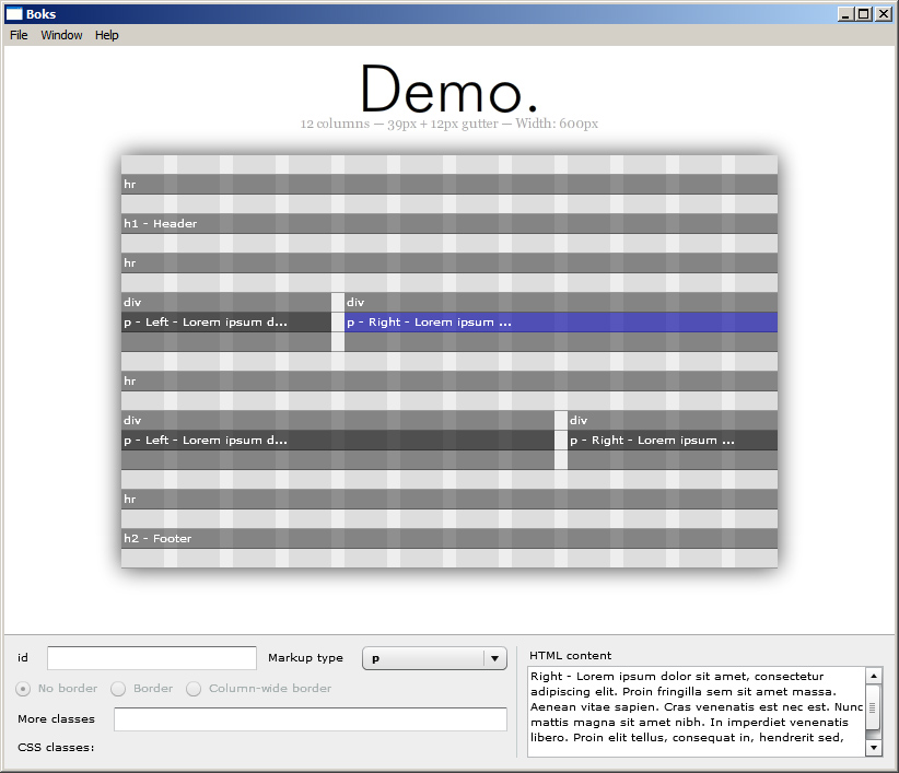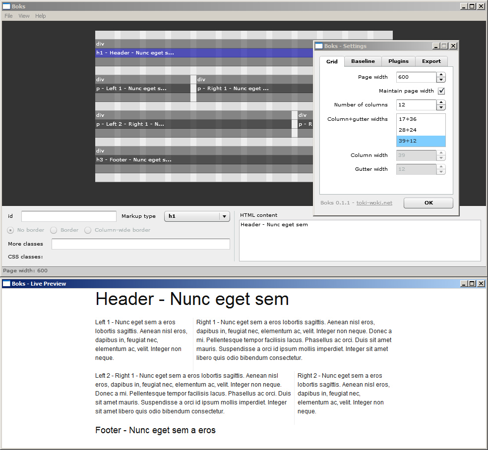 On 29 Mar 2009, at 18:32, Quentin wrote: > > Prime time is now! > > I've just release the app: > http://toki-woki.net/blog/p547-boks-a-visual-grid-editor > Go get it here: http://toki-woki.net/p/Boks/ > Read the (draft) FAQ there: > https://spreadsheets.google.com/pub?key=p34kiFsL74kNsnWsGzy30Aw > > And of course send feedback if you've got some to share... > Yay! > > On Mar 27, 6:40 pm, "~" <[email protected]> wrote: >> Wow. Very nice! I am excited. Good work! >> >> On 3/27/09, Quentin <[email protected]> wrote: >> >> >> >> >> >>> Update! >> >>> With some enhancements and bug fixes... >>> Here's what the app looks like now: >>> http://toki-woki.net/stock/blueprint-wysiwyg/09-new-ui.jpg >>> And the resulting output: >>> http://toki-woki.net/stock/blueprint-wysiwyg/10-demo-export.jpg >> >>> Ciao! >> >>> On Mar 26, 3:31 pm, Marc Funaro <[email protected]> wrote: >>>> Please add me to your beta-testers list. >> >>>> On Thu, Mar 26, 2009 at 6:41 AM, Quentin <[email protected]> >>>> wrote: >> >>>>> Another update! >>>>> Introducing the Live Preview: >>>>> http://toki-woki.net/stock/blueprint-wysiwyg/08-live-preview-borders.jpg >> >>>>> Borders also have been implemented and some bugs fixed! >>>>> Just to keep up with fresh insights, here my working sheet: >>>>> https://spreadsheets.google.com/pub?key=p34kiFsL74kNsnWsGzy30Aw >>>>> There you can see the current FAQ, bug reports and things yet to >>>>> be >>>>> done... >> >>>>> As the previous beta-testers are quite quiet I'm accepting new >>>>> ones, >>>>> just ping me and I'll send you the app. >>>>> See y'all! >> >>>>> On Mar 25, 4:47 pm, Christian Montoya <[email protected]> wrote: >>>>>> On Wed, Mar 25, 2009 at 10:44 AM, Quentin <[email protected]> >>>>>> wrote: >> >>>>>>> Quick update! >>>>>>> I've added a native menu with nice options: Open, Save, >>>>>>> Export... >>>>>>> Which means you can now save your work and update it later, >>>>>>> useful! >> >>>>>> This looks very very awesome! >> >>>>>> -- >>>>>> -- >>>>>> Christian Montoya >>>>>> mappdev.com :: christianmontoya.net > > John Cooper [email protected] ATOMICSHED on the web... twitter, del.icious, flickr, skype ...everywhere --~--~---------~--~----~------------~-------~--~----~ You received this message because you are subscribed to the Google Groups "Blueprint CSS" group. To post to this group, send email to [email protected] To unsubscribe from this group, send email to [email protected] For more options, visit this group at http://groups.google.com/group/blueprintcss?hl=en -~----------~----~----~----~------~----~------~--~---