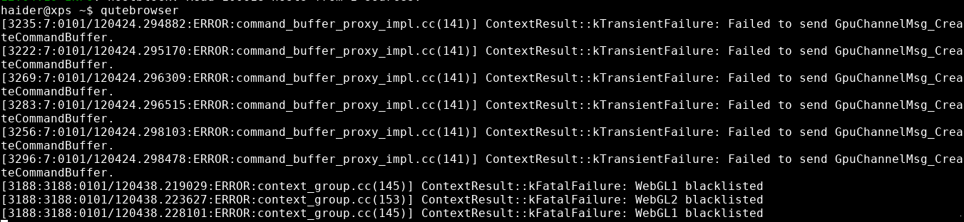 I'm copying this report here: ------ I have installed Qutebrowser on Guix but when I open pages like Github the page does not render some of It's elements (this happens with alot of other pages aswell) so I lunched qutebrowser from the terminal to see anything suspicious and found these error messages: Error Messages The error messages of WebGL being blacklisted come up exactly when I launch pages like Github. BTW: no config was used. However, the error also happens with my config. I am running the latest version of Qutebrowser BTW. ------ And the "Error Messages" are unfortunately an image, which I've attached.