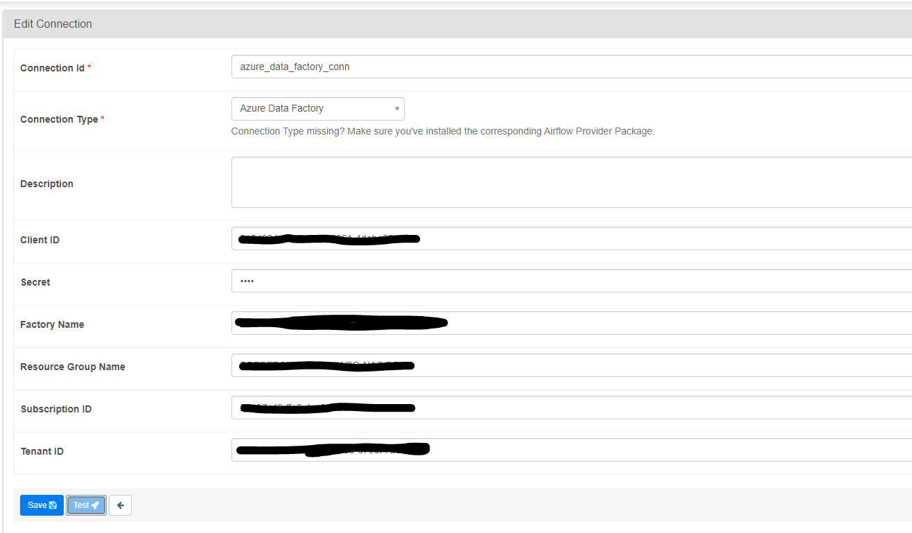 ### Apache Airflow Provider(s) microsoft-azure ### Versions of Apache Airflow Providers apache-airflow-providers-microsoft-azure ### Apache Airflow version 2.2.3 (latest released) ### Operating System windows ### Deployment Other Docker-based deployment ### Deployment details I have a docker image with kubernetes which has all the provider dependencies and other pip installations with official helm chart where I overwrote some values for airflow which are mostly credentials related. ### What happened I am trying to test my azure data factory connection and when I hit the test button after giving client ID, secret, Factory name, resource group name, subscription ID , it displays a red banner but it doesn't say what failed. I am looking to debug this.  My azure connector configuration  red banner indicating something isn't right but it doesn't say what ### What you expected to happen The goal is to see a successful connection to ADF from Airflow so that i can run my ADF pipelines on airflow. ### How to reproduce _No response_ ### Anything else _No response_ ### Are you willing to submit PR? - [ ] Yes I am willing to submit a PR! ### Code of Conduct - [X] I agree to follow this project's [Code of Conduct](https://github.com/apache/airflow/blob/main/CODE_OF_CONDUCT.md) -- This is an automated message from the Apache Git Service. To respond to the message, please log on to GitHub and use the URL above to go to the specific comment. To unsubscribe, e-mail: commits-unsubscr...@airflow.apache.org For queries about this service, please contact Infrastructure at: us...@infra.apache.org