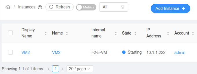 Deploy a new VM using the 'Add instance' dialog. Monitor the 'Instances'