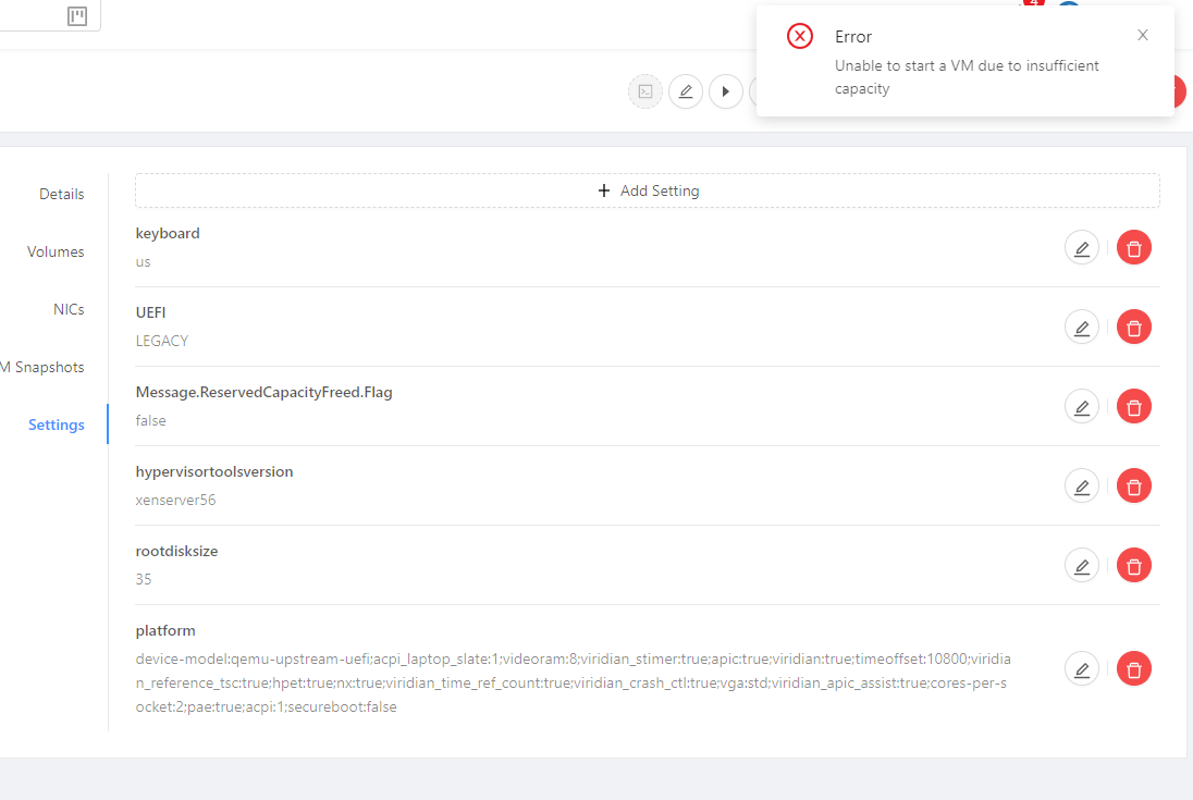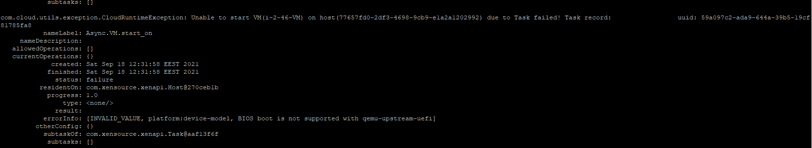 this is a uefi vm working with 4.15.1.0  i have these options, and it does not boot. also from logs i have this error  i understood that with key UEFI and value SECURE OR LEGACY bios option is disabled. but look the error @shwstppr -- This is an automated message from the Apache Git Service. To respond to the message, please log on to GitHub and use the URL above to go to the specific comment. To unsubscribe, e-mail: [email protected] For queries about this service, please contact Infrastructure at: [email protected]