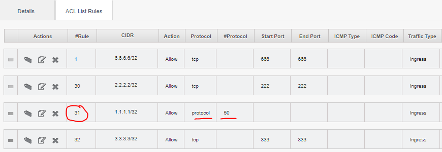 andrijapanicsb opened a new issue #3602: Using custom protocol in ACL rule, breaks ACL URL: https://github.com/apache/cloudstack/issues/3602 <!-- Verify first that your issue/request is not already reported on GitHub. Also test if the latest release and master branch are affected too. Always add information AFTER of these HTML comments, but no need to delete the comments. --> ##### ISSUE TYPE <!-- Pick one below and delete the rest --> * Bug Report ##### COMPONENT NAME <!-- Categorize the issue, e.g. API, VR, VPN, UI, etc. --> ~~~ mgmt, ACL rules handling ~~~ ##### CLOUDSTACK VERSION <!-- New line separated list of affected versions, commit ID for issues on master branch. --> ~~~ tested 4.11.2.0, 4.13.0.0 ~~~ ##### CONFIGURATION <!-- Information about the configuration if relevant, e.g. basic network, advanced networking, etc. N/A otherwise --> VPC, custom ACL with a few (ingress) rules applied to a network ##### OS / ENVIRONMENT <!-- Information about the environment if relevant, N/A otherwise --> NA ##### SUMMARY <!-- Explain the problem/feature briefly --> Adding an ACL rule with a custom **protocol number** (i.e. protocol 50, 51 or any other) - will break ACL/iptables chain inside the VR in following way - all the rules BEFORE this one (rule number lower than the custom protocol rule number) will get properly applied - this specific rule (custom protocol number) will NOT be injected at all inside the VR (seems it is not sent by mgmt server to the VR ) - all the rules that come AFTER this one, will be injected only AFTER the default DENY rule is injected ##### STEPS TO REPRODUCE <!-- For bugs, show exactly how to reproduce the problem, using a minimal test-case. Use Screenshots if accurate. For new features, show how the feature would be used. --> <!-- Paste example playbooks or commands between quotes below --> Create a VPC with custom ACL on the network i.e.:  Confirm rules are properly applied inside the VR: ``` root@r-47-VM:~# iptables-save | grep INBOUND_eth2 :ACL_INBOUND_eth2 - [0:0] -A FORWARD -d 10.10.10.0/24 -o eth2 -j ACL_INBOUND_eth2 -A ACL_INBOUND_eth2 -d 225.0.0.50/32 -j ACCEPT -A ACL_INBOUND_eth2 -d 224.0.0.18/32 -j ACCEPT -A ACL_INBOUND_eth2 -s 6.6.6.6/32 -p tcp -m tcp --dport 666 -j ACCEPT -A ACL_INBOUND_eth2 -s 2.2.2.2/32 -p tcp -m tcp --dport 222 -j ACCEPT -A ACL_INBOUND_eth2 -s 3.3.3.3/32 -p tcp -m tcp --dport 333 -j ACCEPT -A ACL_INBOUND_eth2 -j DROP ``` Now, add a custom rule in the middle of the rules list (rule number 31 in the example below), as follows:  Again examine the rules in the VR: ``` root@r-47-VM:~# iptables-save | grep INBOUND_eth2 :ACL_INBOUND_eth2 - [0:0] -A FORWARD -d 10.10.10.0/24 -o eth2 -j ACL_INBOUND_eth2 -A ACL_INBOUND_eth2 -d 225.0.0.50/32 -j ACCEPT -A ACL_INBOUND_eth2 -d 224.0.0.18/32 -j ACCEPT -A ACL_INBOUND_eth2 -s 6.6.6.6/32 -p tcp -m tcp --dport 666 -j ACCEPT -A ACL_INBOUND_eth2 -s 2.2.2.2/32 -p tcp -m tcp --dport 222 -j ACCEPT -A ACL_INBOUND_eth2 -j DROP -A ACL_INBOUND_eth2 -s 3.3.3.3/32 -p tcp -m tcp --dport 333 -j ACCEPT ``` Notice that: - the rule for protocol 50 is missing (not even mentioned in the /var/log/cloud.log, while inside the management.log there is simply a "success" adding a rule - i.e. no exceptions) - the default DENY rule is applied in the middle of the chain - other rules (the ones that should come after the custom protocol number rule) are added later, below the DENY rule (so they never get evaluated) <!-- You can also paste gist.github.com links for larger files --> ##### EXPECTED RESULTS <!-- What did you expect to happen when running the steps above? --> ~~~ A working ACL. ~~~ ##### ACTUAL RESULTS <!-- What actually happened? --> <!-- Paste verbatim command output between quotes below --> ~~~ Read the "STEPS TO REPRODUCE" section. ~~~