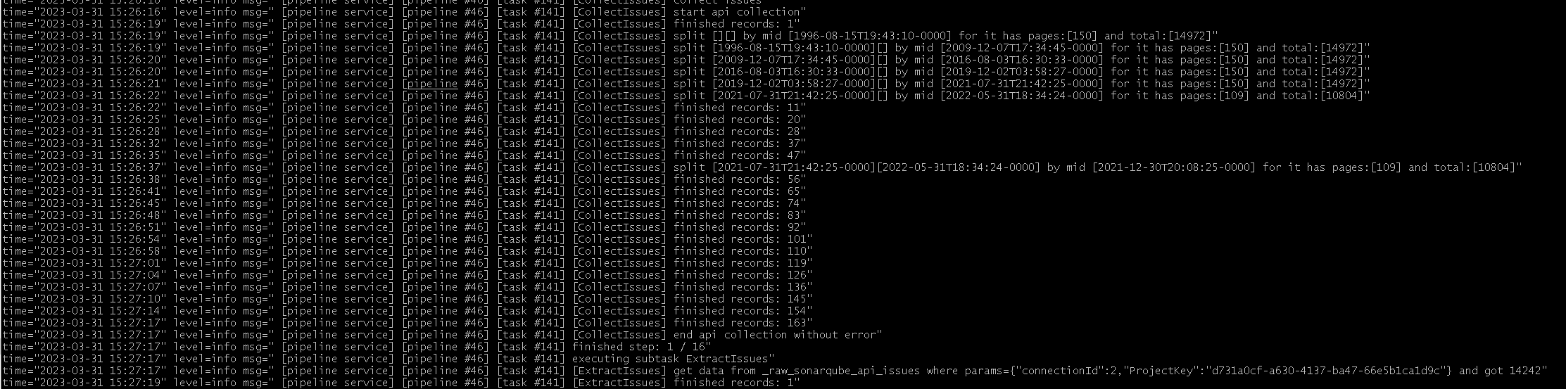 ### Summary Support the SonarQube to collect issues of more than 10000. It splits by created time and if it is still too large, splits again until less than 10000. ### Does this close any open issues? Closes #4592 ### Screenshots   -- This is an automated message from the Apache Git Service. To respond to the message, please log on to GitHub and use the URL above to go to the specific comment. To unsubscribe, e-mail: [email protected] For queries about this service, please contact Infrastructure at: [email protected]