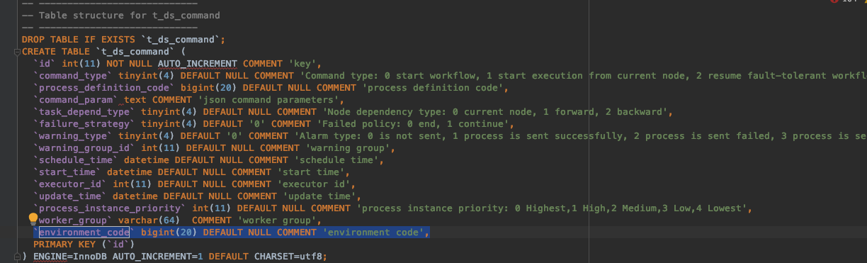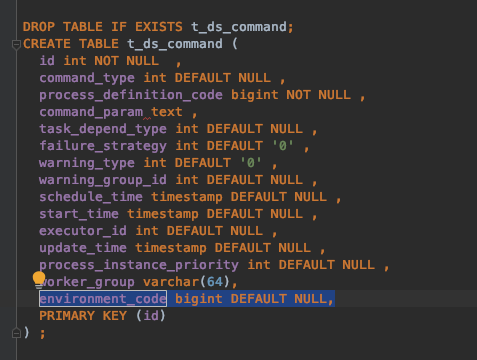 <!--Thanks very much for contributing to Apache DolphinScheduler. Please review https://dolphinscheduler.apache.org/en-us/community/development/pull-request.html before opening a pull request.--> ## Purpose of the pull request This PR will close #6159. <!--(For example: This pull request adds checkstyle plugin).--> ## Brief change log <!--*(for example:)* - *Add maven-checkstyle-plugin to root pom.xml* --> - Adjust the default value of the field environment code from '-1' to 'null' in the dolphinscheduler_mysql.sql. So the default value of this field will be same both in dolphinscheduler_mysql.sql and dolphinscheduler_postgre.sql . In the dolphinscheduler_mysql.sql:  In the dolphinscheduler_postgre.sql:  ## Verify this pull request <!--*(Please pick either of the following options)*--> This change added tests and can be verified as follows: - *Manually verified the change by testing locally.* -- This is an automated message from the Apache Git Service. To respond to the message, please log on to GitHub and use the URL above to go to the specific comment. To unsubscribe, e-mail: [email protected] For queries about this service, please contact Infrastructure at: [email protected]