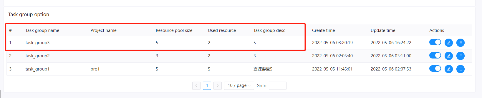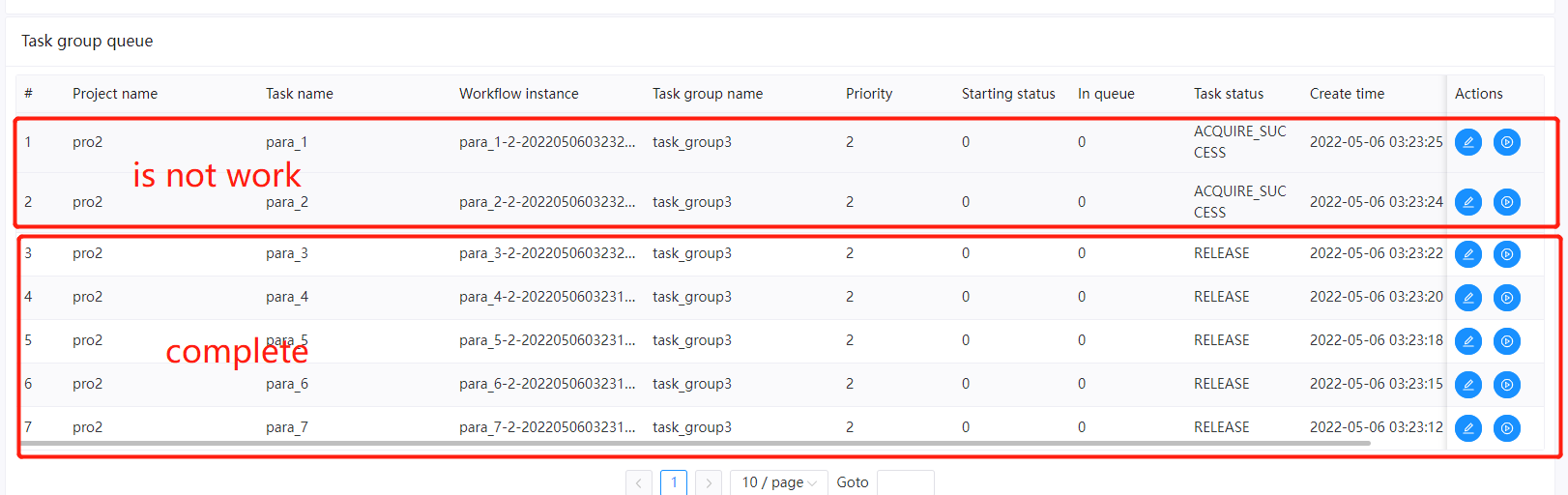 ### Search before asking - [X] I had searched in the [issues](https://github.com/apache/dolphinscheduler/issues?q=is%3Aissue) and found no similar issues. ### What happened I define a task group and make the 'Resource pool size' = 5 ,when i run 7 task ,the before 5 task run complete,but the last 2 is not work     ### What you expected to happen when the task group has free resoruce.the last 2 task can work normally ### How to reproduce when the task group has free resoruce.the last 2 task can work normally ### Anything else _No response_ ### Version 3.0.0-alpha ### Are you willing to submit PR? - [ ] Yes I am willing to submit a PR! ### Code of Conduct - [X] I agree to follow this project's [Code of Conduct](https://www.apache.org/foundation/policies/conduct) -- This is an automated message from the Apache Git Service. To respond to the message, please log on to GitHub and use the URL above to go to the specific comment. To unsubscribe, e-mail: [email protected] For queries about this service, please contact Infrastructure at: [email protected]