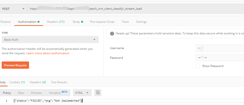 HiwayChe opened a new issue #2108: postman stream load failed URL: https://github.com/apache/incubator-doris/issues/2108 I have read this manual: https://github.com/apache/incubator-doris/blob/master/docs/documentation/cn/administrator-guide/load-data/stream-load-manual.md, it says doris support loading data by stream load using http, in this manual it use `curl`, I tried and succeed, but it failed in postman, here is my `curl` command and postman configuration. `curl` command:  postman configuration:    As you see, it failed in postman, doris server return 501(Not Implemented), do I miss something?