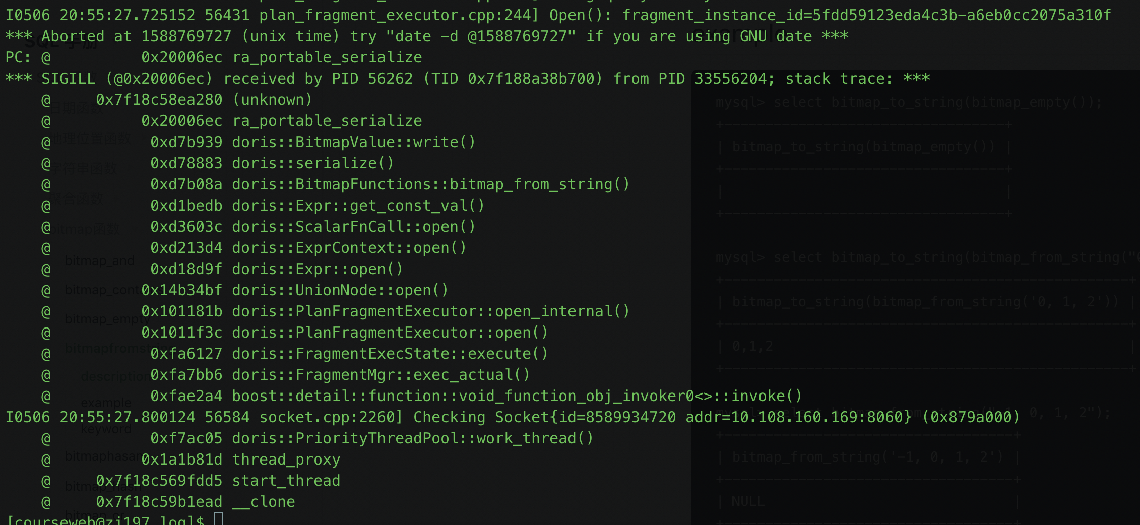 **Describe the bug** Be all hang up <img width="888" alt="截屏2020-05-06 下午9 33 17" src="https://user-images.githubusercontent.com/24592373/81183121-55e97c00-8fe1-11ea-8944-13f8f4f1dd39.png"> When I used `select bitmap_to_string(bitmap_from_string('0, 1, 2'));`, the following error occurred  **version** master ---------------------------------------------------------------- This is an automated message from the Apache Git Service. To respond to the message, please log on to GitHub and use the URL above to go to the specific comment. For queries about this service, please contact Infrastructure at: [email protected] --------------------------------------------------------------------- To unsubscribe, e-mail: [email protected] For additional commands, e-mail: [email protected]