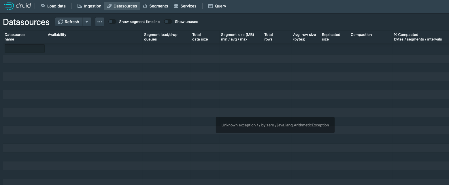 I am facing this issue with `.20`.   This can be understood from the part of query ``` ( SUM("size") FILTER (WHERE (is_published = 1 AND is_overshadowed = 0)) / SUM("num_rows") FILTER (WHERE (is_published = 1 AND is_overshadowed = 0)) ) AS avg_row_size ``` some cases the `num_rows` are zero untill fully loaded. _Note: In our case we are deploying new boxes while upgrading resulting in Historical to pull all the segments._ ---------------------------------------------------------------- This is an automated message from the Apache Git Service. To respond to the message, please log on to GitHub and use the URL above to go to the specific comment. For queries about this service, please contact Infrastructure at: [email protected] --------------------------------------------------------------------- To unsubscribe, e-mail: [email protected] For additional commands, e-mail: [email protected]