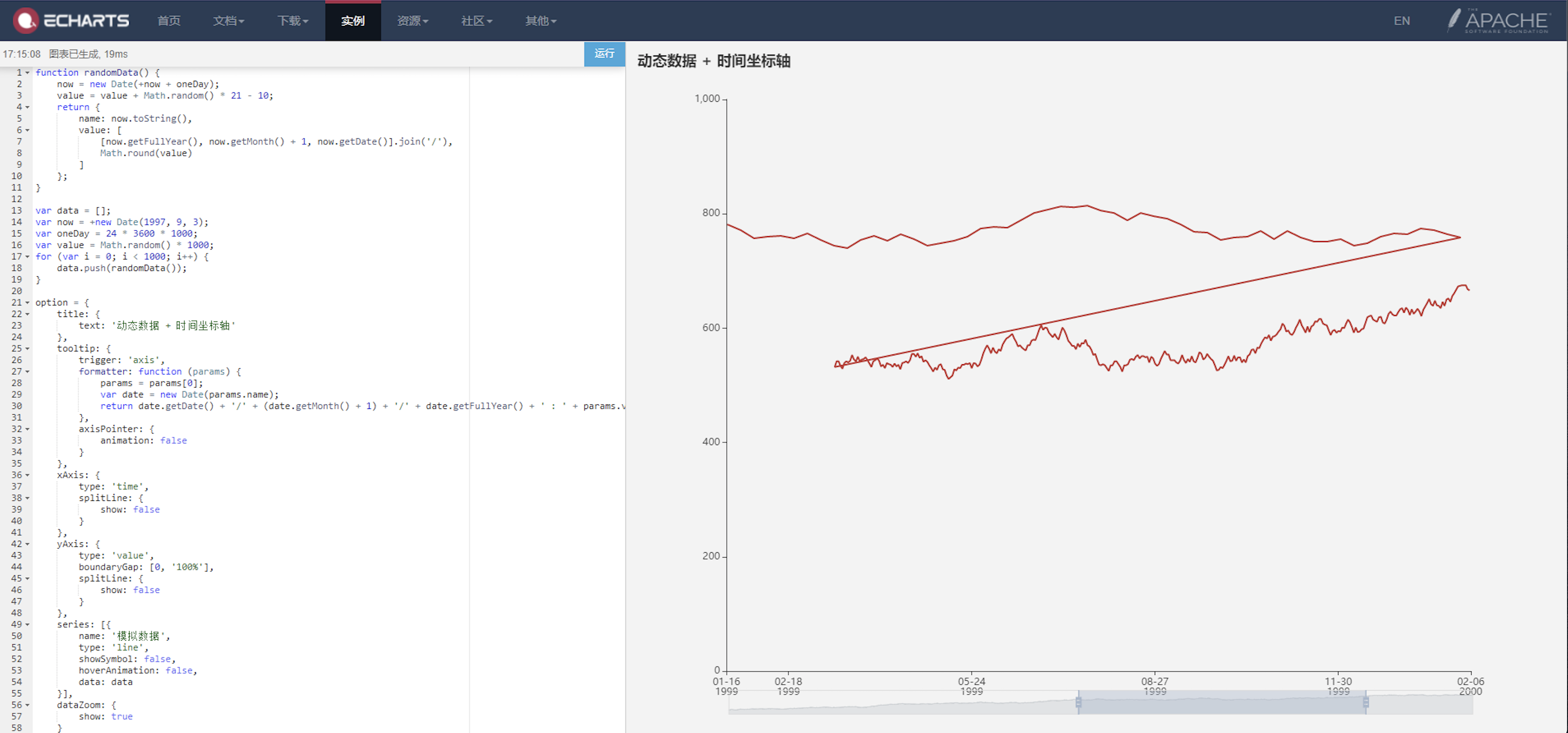 ### Version https://cdn.jsdelivr.net/npm/echarts@4/dist/echarts.min.js?_v_=1611323308745 ### Reproduction link [https://echarts.apache.org/v4/examples/en/editor.html?c=dynamic-data2](https://echarts.apache.org/v4/examples/en/editor.html?c=dynamic-data2) ### Steps to reproduce copy code: function randomData() { now = new Date( now oneDay); value = value Math.random() * 21 - 10; return { name: now.toString(), value: [ [now.getFullYear(), now.getMonth() 1, now.getDate()].join('/'), Math.round(value) ] }; } var data = []; var now = new Date(1997, 9, 3); var oneDay = 24 * 3600 * 1000; var value = Math.random() * 1000; for (var i = 0; i < 1000; i ) { data.push(randomData()); } option = { title: { text: '动态数据 时间坐标轴' }, tooltip: { trigger: 'axis', formatter: function (params) { params = params[0]; var date = new Date(params.name); return date.getDate() '/' (date.getMonth() 1) '/' date.getFullYear() ' : ' params.value[1]; }, axisPointer: { animation: false } }, xAxis: { type: 'time', splitLine: { show: false } }, yAxis: { type: 'value', boundaryGap: [0, '100%'], splitLine: { show: false } }, series: [{ name: '模拟数据', type: 'line', showSymbol: false, hoverAnimation: false, data: data }] }; setInterval(function () { for (var i = 0; i < 5; i ) { data.shift(); data.push(randomData()); } myChart.setOption({ series: [{ data: data }] }); }, 1000); quickly drug zoom bar ### What is expected? display normally ### What is actually happening? line map messed --- Screenshot link: https://z3.ax1x.com/2021/07/04/RfkDHO.png <!-- This issue is generated by echarts-issue-helper. DO NOT REMOVE --> <!-- This issue is in English. DO NOT REMOVE --> -- This is an automated message from the Apache Git Service. To respond to the message, please log on to GitHub and use the URL above to go to the specific comment. To unsubscribe, e-mail: [email protected] For queries about this service, please contact Infrastructure at: [email protected] --------------------------------------------------------------------- To unsubscribe, e-mail: [email protected] For additional commands, e-mail: [email protected]