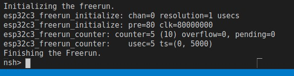 ## Summary This PR creates a freerun wrapper for ESP32-C3. ## Impact N/A ## Testing Tests results: To perform a test por the freerun wrapper was a little bit tricky, since it is not exposed as a character driver like oneshot is. So, I had to "violate" and call it from the user space:  To make sure the the timer was properly configured and ensure its accuracy I tested the get counter function from the signal handler of the timer example because `usleep` and similar functions don't garante accuracy. Besides that, since the freerun standard timeout period is too long (the maximum the timer can count), I used other short period only to test the interrupt. Dependencies: Any timer instance that will be used by the freerun and CONFIG_ESP32_FREERUN. NOTE for future users: If someone wishes to develop some driver upon the freerun wrapper, have to keep in mind that the timer logic on bringup must be adjusted to prevent the timer used by the freerun wrapper to be initialized as a character driver. Just like it was done for the oneshot. For now, since nothing is currently using freerun, there was anything to do on bringup. -- This is an automated message from the Apache Git Service. To respond to the message, please log on to GitHub and use the URL above to go to the specific comment. For queries about this service, please contact Infrastructure at: [email protected]