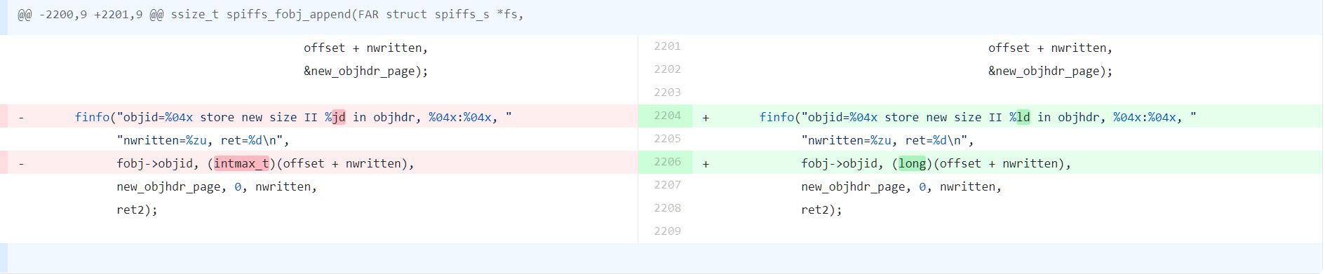 @xiaoxiang781216 I am not understanding the change. I thought the left side was the "correct way" What was the reason for these:  Did you back them out to save on the code space? Would you explain how this works when on a 32 bit machine with large support? Are we going to truncate the offsets in debug? Would something like [this](https://patchwork.ozlabs.org/project/linux-mtd/patch/[email protected]/) be better all the way around? -- This is an automated message from the Apache Git Service. To respond to the message, please log on to GitHub and use the URL above to go to the specific comment. To unsubscribe, e-mail: [email protected] For queries about this service, please contact Infrastructure at: [email protected]