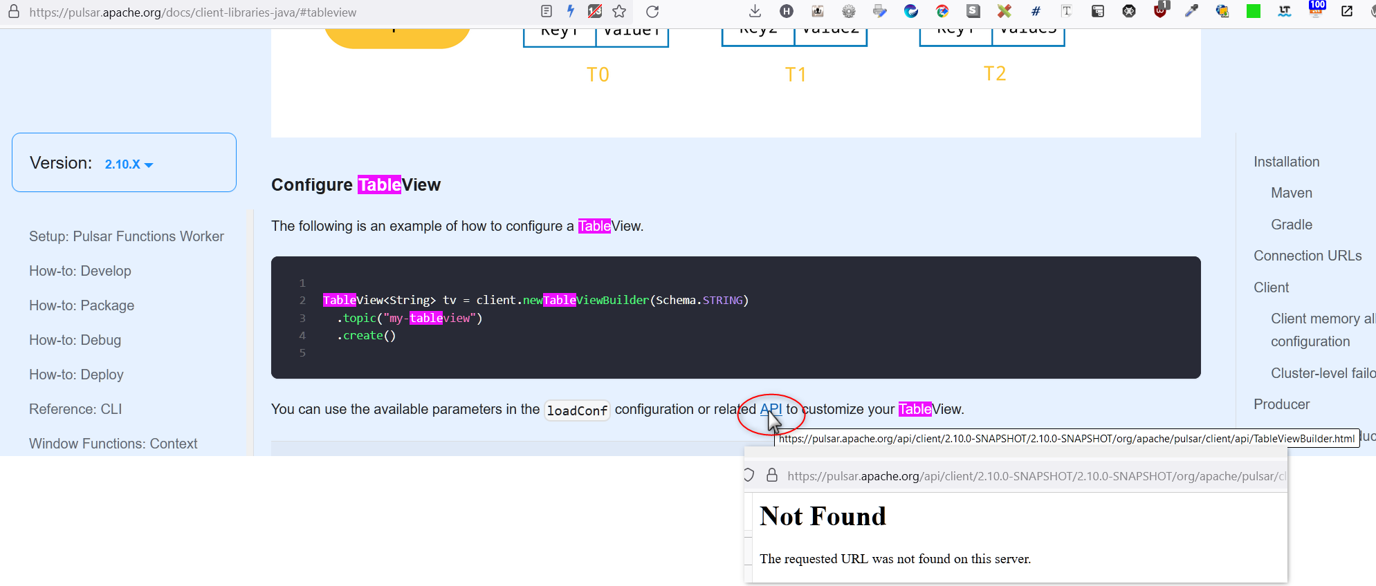 is this one already in the task list? couldn't find it: in https://pulsar.apache.org/docs/client-libraries-java/#tableview `api `pointing to https://pulsar.apache.org/api/client/2.10.0-SNAPSHOT/2.10.0-SNAPSHOT/org/apache/pulsar/client/api/TableViewBuilder.html  -- This is an automated message from the Apache Git Service. To respond to the message, please log on to GitHub and use the URL above to go to the specific comment. To unsubscribe, e-mail: [email protected] For queries about this service, please contact Infrastructure at: [email protected]