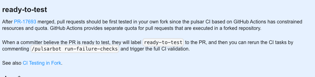 > FYI: markdown doc changes can skip this step > > <img alt="image" width="337" src="https://user-images.githubusercontent.com/50226895/206956621-0444d577-1de3-4dec-9181-e3bfb25a6c87.png"> > > https://github.com/apache/pulsar/blob/346b04a8149df0683891408456bd4306b39f2103/.github/changes-filter.yaml#L9 @Anonymitaet Maybe we should note that in the documentation contribution guide. I followed https://pulsar.apache.org/contribute/document-intro/, which says:  and here https://pulsar.apache.org/contribute/develop-labels/ it says  -- This is an automated message from the Apache Git Service. To respond to the message, please log on to GitHub and use the URL above to go to the specific comment. To unsubscribe, e-mail: [email protected] For queries about this service, please contact Infrastructure at: [email protected]