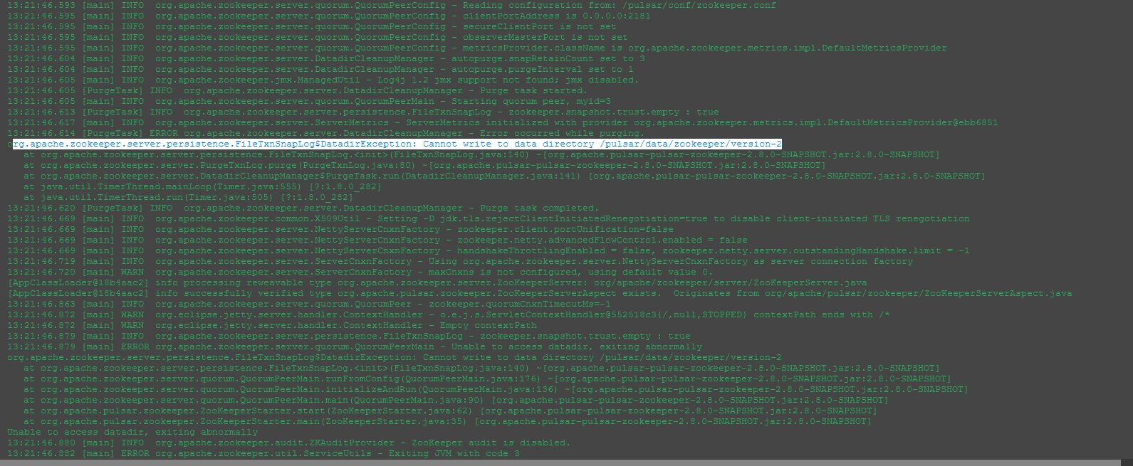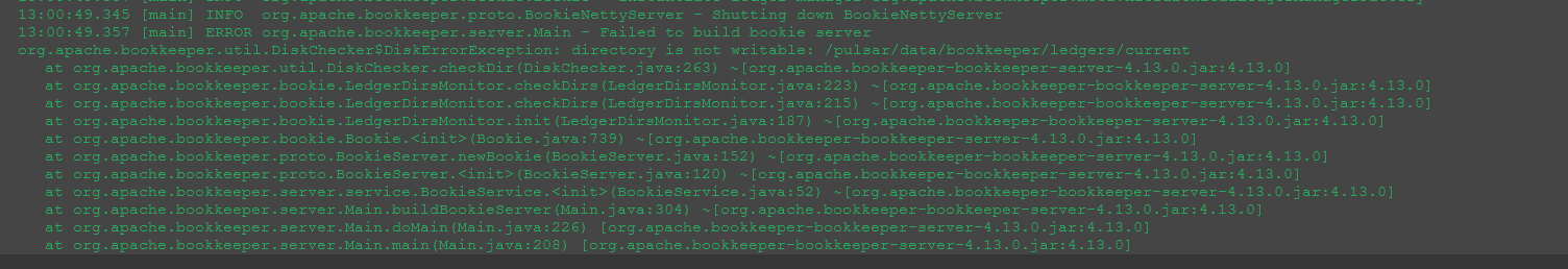 **Describe the bug** After trying to migrate from apache pulsar 2.7.0 to 2.8 version, i face some issues on runtime: Pulsar is deployed in a k8s deployement ( not in standalone) I build apache pulsar 2.8 by my self by exeecuting mvn build of pulsar project ( " mvn -Pcore-modules -T 1C clean install -DskipTests -Dspotbugs.skip=true). Then, i execute docker build file that is under docker folder in order to build and push docker images into my private registry After changing image in my yml config , i face below issues on runtime: in bookie: - org.apache.bookkeeper.util.DiskChecker$DiskErrorException: directory is not writable: /pulsar/data/bookkeeper/ledgers/current in zookie: - org.apache.zookeeper.server.persistence.FileTxnSnapLog$DatadirException: Cannot write to data directory /pulsar/data/zookeeper/version-2 Any hints about what does that mean ? did i make something bad during build steps ? as in bookie and zookie deployment it seems to be writable right ... I would like to specify i didn't face this issues when i test my build in standalone mode. **To Reproduce** Steps to reproduce the behavior: 1. move from 2.7.0 to 2.8.0 version 2. restart pulsar bookkie, zookkie, broker, proxy one by one 3. check logs **Screenshots** bookkie screenshot:  zookkie screenshot:  **Desktop (please complete the following information):** - OS: linux - maven 3.6.3 - jdk used to build: openjdk8 -- This is an automated message from the Apache Git Service. To respond to the message, please log on to GitHub and use the URL above to go to the specific comment. For queries about this service, please contact Infrastructure at: [email protected]