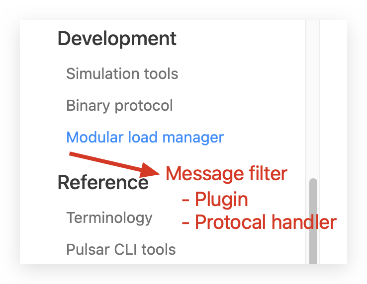 Hi @315157973 for the doc side, I've discussed with @codelipenghui, he suggests creating an independent chapter `message filter` under `Development` and considering adding `plugin` and `protocol handler` sections under that chapter.  -- This is an automated message from the Apache Git Service. To respond to the message, please log on to GitHub and use the URL above to go to the specific comment. To unsubscribe, e-mail: [email protected] For queries about this service, please contact Infrastructure at: [email protected]
