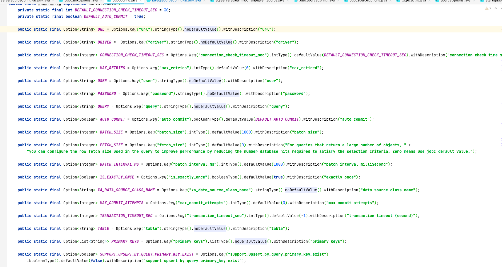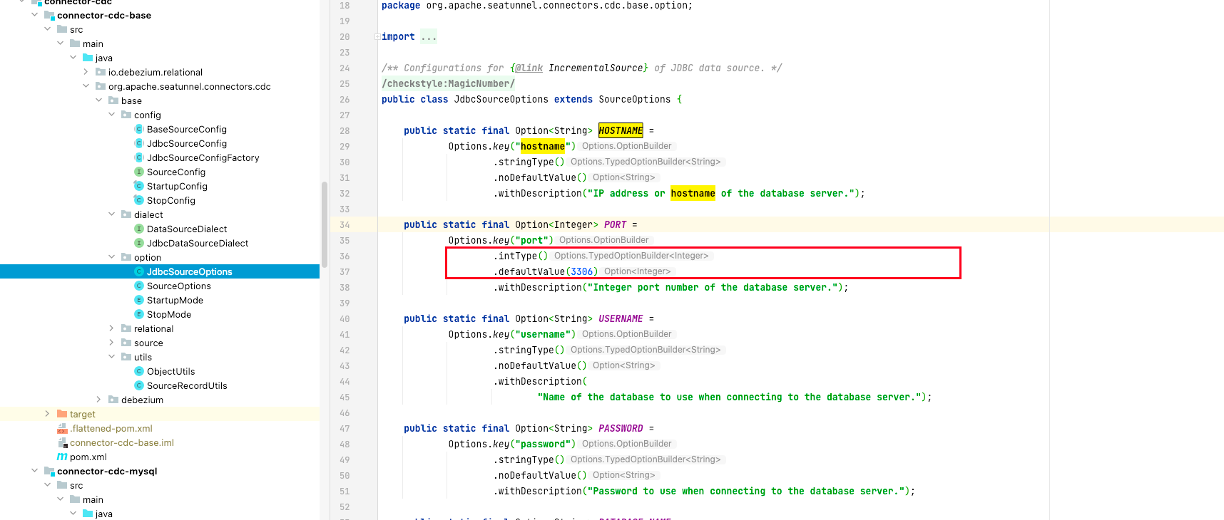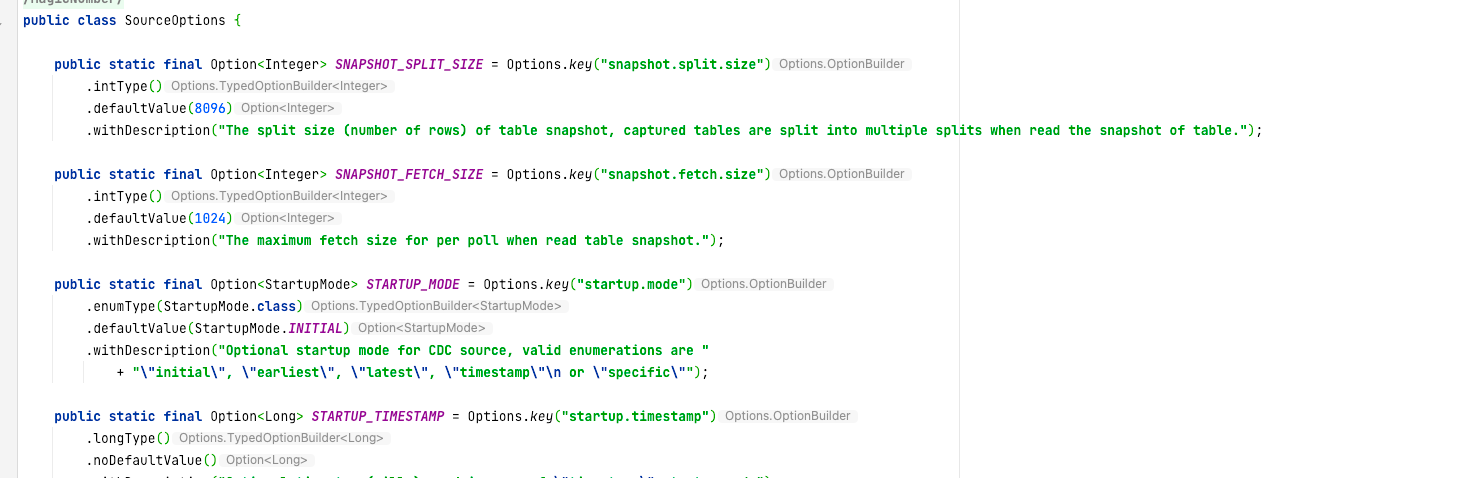 ### Search before asking - [X] I had searched in the [feature](https://github.com/apache/incubator-seatunnel/issues?q=is%3Aissue+label%3A%22Feature%22) and found no similar feature requirement. ### Description ### Hello everyone, when I looked at the source code related to cdc, I found that there are some things that seem to be improved #### Question 1 - When constructing MySql, SqlServer, and SourceConfig, some repeated string keys appear directly in the code - Is it possible to extract these same operations involved in building Properties into public methods, each class only needs to handle different content separately? - Make other JdbcSourceConfigFactory subclass factory code simpler and more elegant. - Below is the existing code - mysql  - sqlServer  #### Question 2 - The JdbcSourceOptions class in the connector-cdc-base module is a public options class, and the PORT field attribute defaults to 3306. This port is only used by mysql, and other databases may have some hidden dangers when using this key.  #### Question 3 - I found that there may be inelegant writing in the code of some options - For example    --- #### Remarks - I have carefully read the source code of flink, and some excellent codes related to options and configuration of flink can simplify integration into the seatunnel project. - Hope to join this project and submit an issue for the first time. Hope my suggestion can make the seatunnel part code more elegant. - If my suggestion is effective, please assign me this task。 - Can you leave valuable suggestions on this issue, which will enable me to integrate into the seatunel project more quickly。Tasnks [How to join this project](https://github.com/apache/incubator-seatunnel/discussions/397) ### Usage Scenario _No response_ ### Related issues _No response_ ### Are you willing to submit a PR? - [X] Yes I am willing to submit a PR! ### Code of Conduct - [X] I agree to follow this project's [Code of Conduct](https://www.apache.org/foundation/policies/conduct) -- This is an automated message from the Apache Git Service. To respond to the message, please log on to GitHub and use the URL above to go to the specific comment. To unsubscribe, e-mail: [email protected] For queries about this service, please contact Infrastructure at: [email protected]