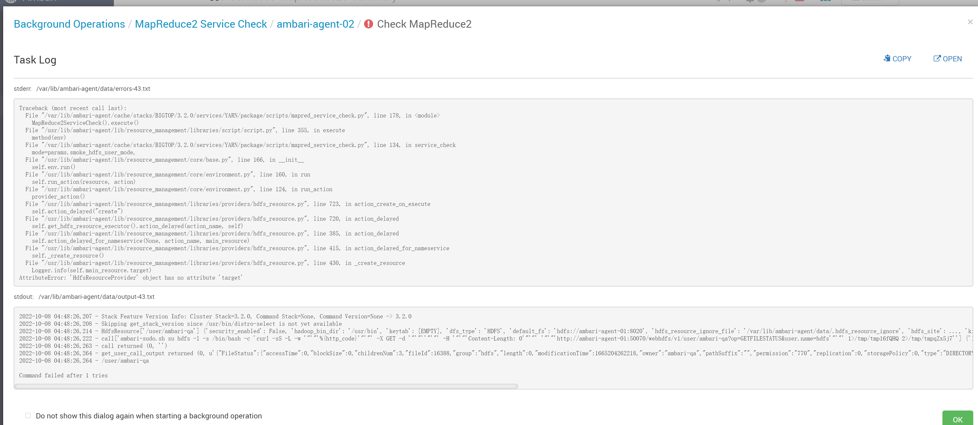 > BTW, self.main_resource.target seems incorrect here, should it be self.main_resource.resource.target? Can you help check it? > https://github.com/apache/ambari/blob/trunk/ambari-> common/src/main/python/resource_management/libraries/providers/hdfs_resource.py#L429 When I want to get `self.main_resource.target`, it report a error as `AttributeError: 'HdfsResourceProvider' object has no attribute 'target'`.  -- This is an automated message from the Apache Git Service. To respond to the message, please log on to GitHub and use the URL above to go to the specific comment. To unsubscribe, e-mail: [email protected] For queries about this service, please contact Infrastructure at: [email protected] --------------------------------------------------------------------- To unsubscribe, e-mail: [email protected] For additional commands, e-mail: [email protected]