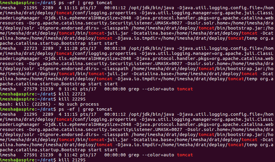 IMS94 opened a new issue #128: "bin/oodt stop" won't stop tomcat causing system to go out of memory URL: https://github.com/apache/drat/issues/128 I was testing OODT with DRAT and saw that the tomcat process created by the `bin/oodt start` command doesn't get killed/stopped on `bin/oodt stop` which causes the RAM to go out of memory if we run `oodt start` multiple times. Below is an example in my machine where there were many tomcat processes running.