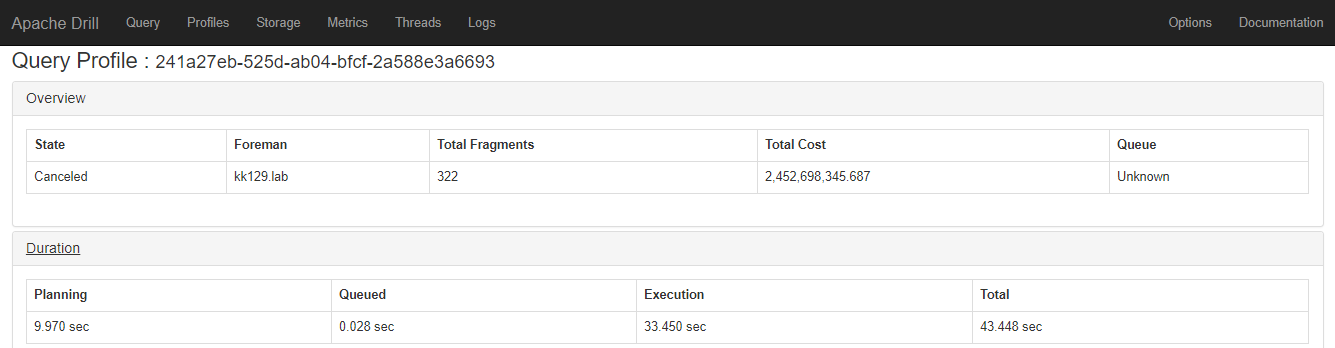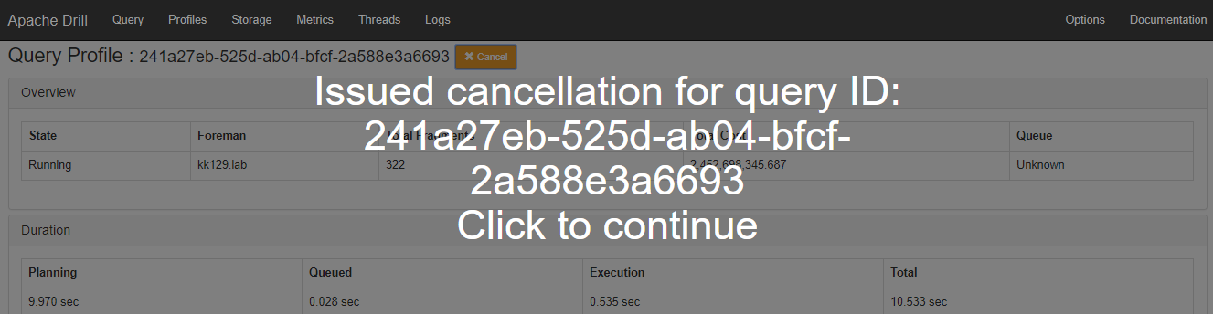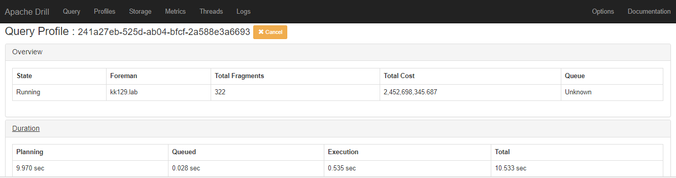 kkhatua opened a new pull request #1531: DRILL-5571: Cancel running query from its Web UI URL: https://github.com/apache/drill/pull/1531 Currently, a running query can be cancelled by navigating to the Edit Query Tab of the profile page, making it difficult to access. This commit allows the user to cancel from the query page. In addition, the Duration segment is also made visible by default rather than collapsed. Screenshot of a running query  Screenshot of a query being cancelled  Screenshot of a query after cancellation