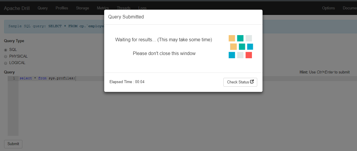 kkhatua opened a new pull request #1592: DRILL-6939: Indicate when a query is submitted and is in progress URL: https://github.com/apache/drill/pull/1592 On query submission, a modal popup blocks further interaction until the result of the query are available. Since the Query ID is not available at this point, the only way to cancel a running query is to navigate to it via the `/profiles` tab. For this, the modal allows a button to pop out to this tab without closing the current window which is waiting for the result-set. Screenshot (when querying sys.profiles with 5.8K entries)