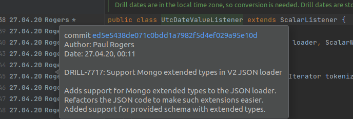 > @vdiravka, the commit in question was something I pushed about a week ago: it was some last changes that were still on my local machine that I'd not yet pushed. Sorry about that! They were not on GitHub when you grabbed the original commits. For example, the new file `UtcDateValueListener.java` which I don't see in the list of files for this PR. Can you grab this commit also? For passing session option in tests I have created the new methods `enableSessionOption`, `disableSessionOption` based on the building the string `optionSettingQueriesForTestQuery` in `TestBuilder`. I see, you've already commited this changes and file in `DRILL-7717: Support Mongo extended types in V2 JSON loader` #2068  -- This is an automated message from the Apache Git Service. To respond to the message, please log on to GitHub and use the URL above to go to the specific comment. To unsubscribe, e-mail: [email protected] For queries about this service, please contact Infrastructure at: [email protected]