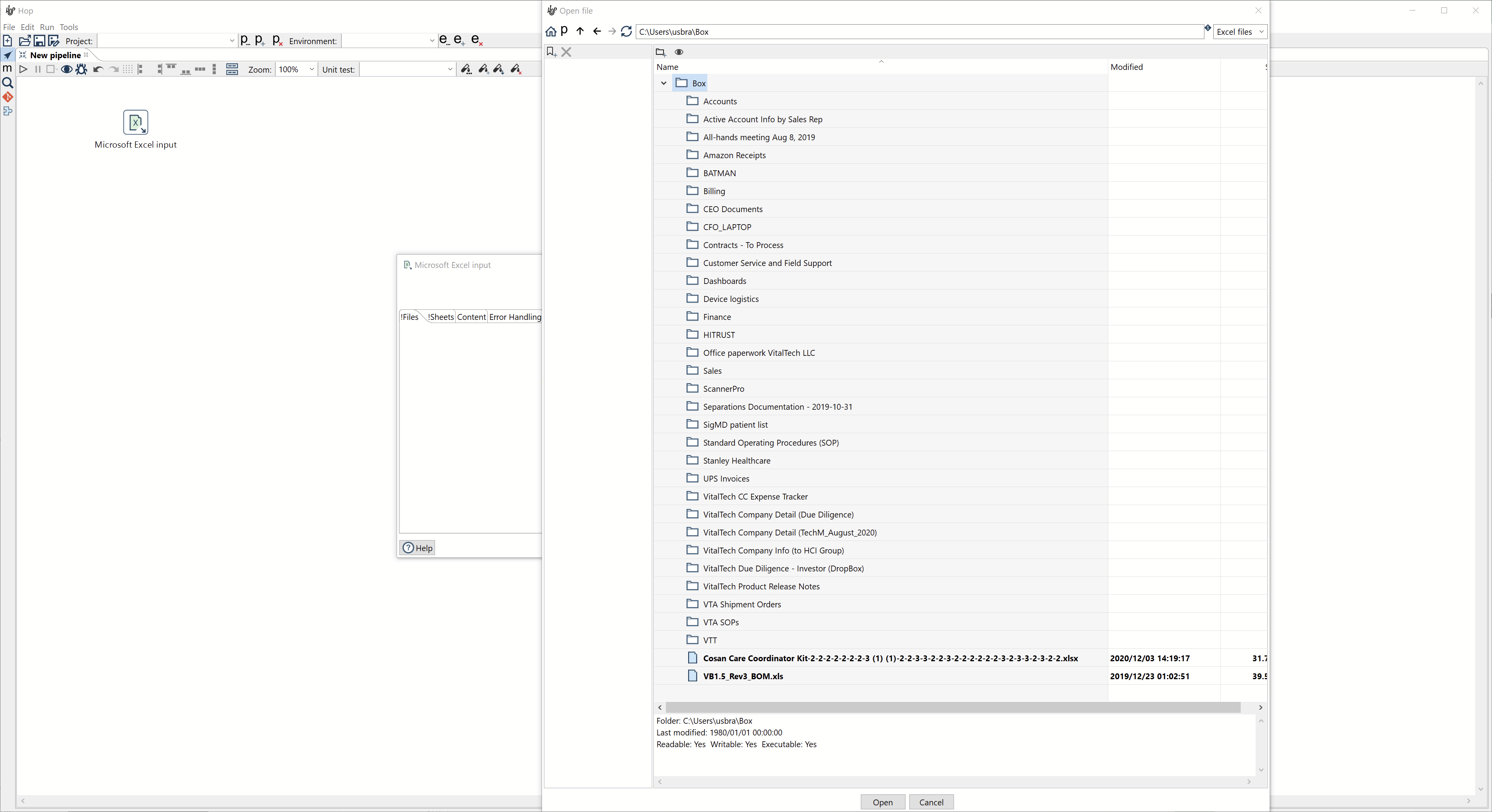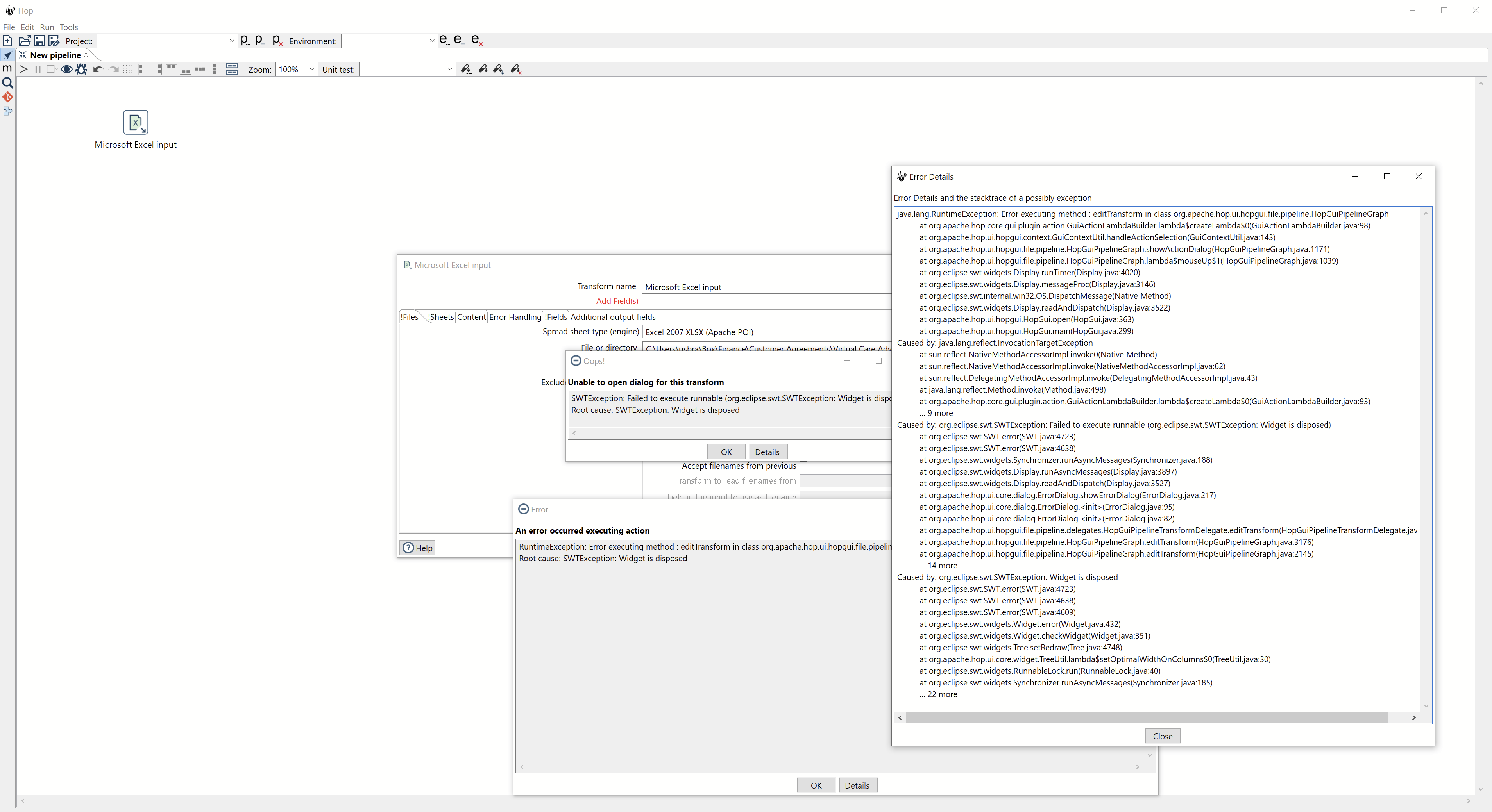 I got further, but something else fails about the file selection. For example when I used an Excel Input step (no project, no environment), and just browsed to an Excel file in my home directory, once I clicked OK, then there is a SWT Widget disposed problem.  The following stack trace was present: java.lang.RuntimeException: Error executing method : editTransform in class org.apache.hop.ui.hopgui.file.pipeline.HopGuiPipelineGraph at org.apache.hop.core.gui.plugin.action.GuiActionLambdaBuilder.lambda$createLambda$0(GuiActionLambdaBuilder.java:98) at org.apache.hop.ui.hopgui.context.GuiContextUtil.handleActionSelection(GuiContextUtil.java:143) at org.apache.hop.ui.hopgui.file.pipeline.HopGuiPipelineGraph.showActionDialog(HopGuiPipelineGraph.java:1171) at org.apache.hop.ui.hopgui.file.pipeline.HopGuiPipelineGraph.lambda$mouseUp$1(HopGuiPipelineGraph.java:1039) at org.eclipse.swt.widgets.Display.runTimer(Display.java:4020) at org.eclipse.swt.widgets.Display.messageProc(Display.java:3146) at org.eclipse.swt.internal.win32.OS.DispatchMessage(Native Method) at org.eclipse.swt.widgets.Display.readAndDispatch(Display.java:3522) at org.apache.hop.ui.hopgui.HopGui.open(HopGui.java:363) at org.apache.hop.ui.hopgui.HopGui.main(HopGui.java:299) Caused by: java.lang.reflect.InvocationTargetException at sun.reflect.NativeMethodAccessorImpl.invoke0(Native Method) at sun.reflect.NativeMethodAccessorImpl.invoke(NativeMethodAccessorImpl.java:62) at sun.reflect.DelegatingMethodAccessorImpl.invoke(DelegatingMethodAccessorImpl.java:43) at java.lang.reflect.Method.invoke(Method.java:498) at org.apache.hop.core.gui.plugin.action.GuiActionLambdaBuilder.lambda$createLambda$0(GuiActionLambdaBuilder.java:93) ... 9 more Caused by: org.eclipse.swt.SWTException: Failed to execute runnable (org.eclipse.swt.SWTException: Widget is disposed) at org.eclipse.swt.SWT.error(SWT.java:4723) at org.eclipse.swt.SWT.error(SWT.java:4638) at org.eclipse.swt.widgets.Synchronizer.runAsyncMessages(Synchronizer.java:188) at org.eclipse.swt.widgets.Display.runAsyncMessages(Display.java:3897) at org.eclipse.swt.widgets.Display.readAndDispatch(Display.java:3527) at org.apache.hop.ui.core.dialog.ErrorDialog.showErrorDialog(ErrorDialog.java:217) at org.apache.hop.ui.core.dialog.ErrorDialog.<init>(ErrorDialog.java:95) at org.apache.hop.ui.core.dialog.ErrorDialog.<init>(ErrorDialog.java:82) at org.apache.hop.ui.hopgui.file.pipeline.delegates.HopGuiPipelineTransformDelegate.editTransform(HopGuiPipelineTransformDelegate.java:226) at org.apache.hop.ui.hopgui.file.pipeline.HopGuiPipelineGraph.editTransform(HopGuiPipelineGraph.java:3176) at org.apache.hop.ui.hopgui.file.pipeline.HopGuiPipelineGraph.editTransform(HopGuiPipelineGraph.java:2145) ... 14 more Caused by: org.eclipse.swt.SWTException: Widget is disposed at org.eclipse.swt.SWT.error(SWT.java:4723) at org.eclipse.swt.SWT.error(SWT.java:4638) at org.eclipse.swt.SWT.error(SWT.java:4609) at org.eclipse.swt.widgets.Widget.error(Widget.java:432) at org.eclipse.swt.widgets.Widget.checkWidget(Widget.java:351) at org.eclipse.swt.widgets.Tree.setRedraw(Tree.java:4748) at org.apache.hop.ui.core.widget.TreeUtil.lambda$setOptimalWidthOnColumns$0(TreeUtil.java:30) at org.eclipse.swt.widgets.RunnableLock.run(RunnableLock.java:40) at org.eclipse.swt.widgets.Synchronizer.runAsyncMessages(Synchronizer.java:185) ... 22 more Another small glitch is while browsing to the folder, I happened to have a really long file in one of the directories. The horizontal scroll bar at the bottom would not allow any kind of movement and it seemed like the UI froze for a moment. After the UI became responsive again, I was able to browse for the Excel file I was looking for, and upon selecting it, the above stack trace came out.  ---------------------------------------------------------------- This is an automated message from the Apache Git Service. To respond to the message, please log on to GitHub and use the URL above to go to the specific comment. For queries about this service, please contact Infrastructure at: [email protected]