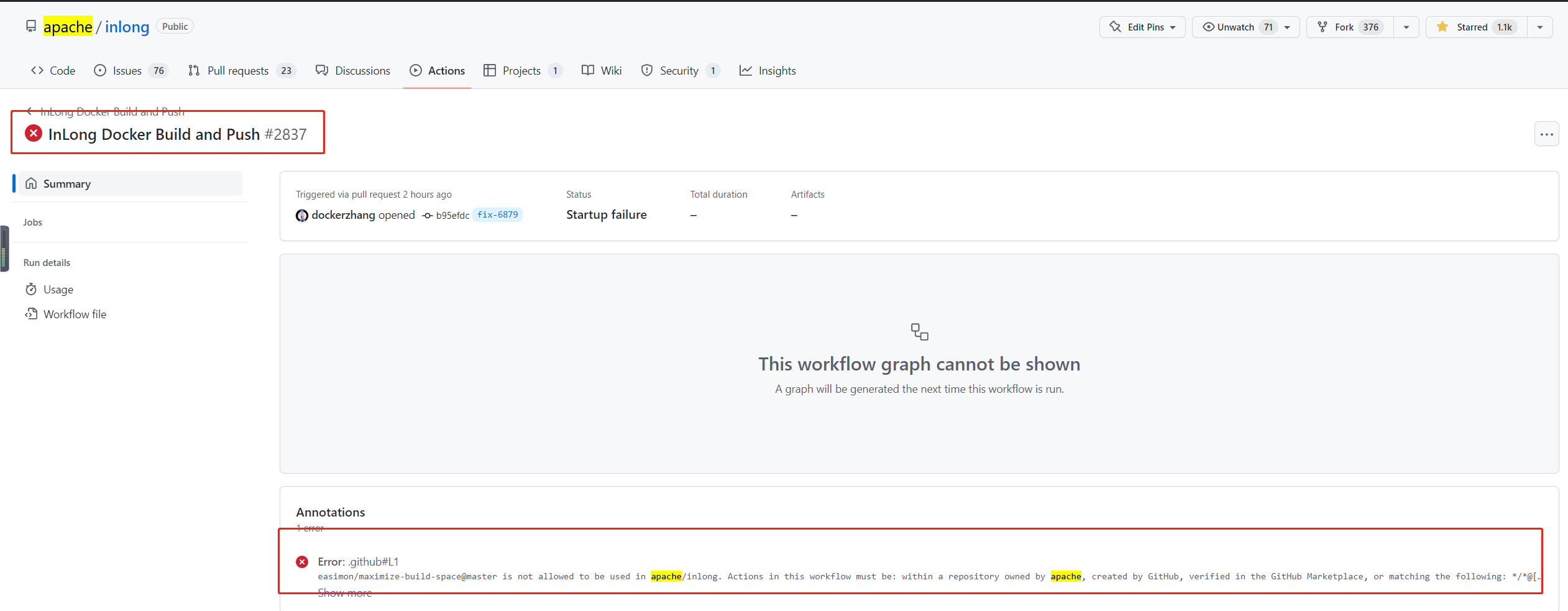 ### What happened All Docker workflow failed.  ### What you expected to happen Run successfully. ### How to reproduce see https://github.com/apache/inlong/actions/workflows/ci_docker.yml ### Environment _No response_ ### InLong version master ### InLong Component Other for not specified component ### Are you willing to submit PR? - [X] Yes, I am willing to submit a PR! ### Code of Conduct - [X] I agree to follow this project's [Code of Conduct](https://www.apache.org/foundation/policies/conduct) -- This is an automated message from the Apache Git Service. To respond to the message, please log on to GitHub and use the URL above to go to the specific comment. To unsubscribe, e-mail: [email protected] For queries about this service, please contact Infrastructure at: [email protected]