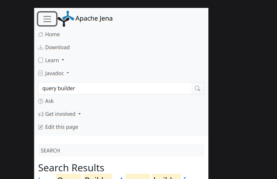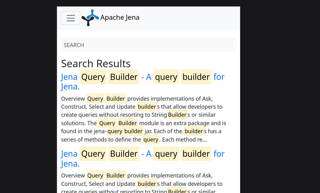 p.s. we could also use Algolia free, which I use for some sites I maintain, but someone needs to have the account and maintain the token, and it has a high limit but that Jena could reach as we have a lot of users I think... so in the end I thought this was the simplest option to have search in our site, for now :+1: Ah! And here's the search on smaller viewports.   -- This is an automated message from the Apache Git Service. To respond to the message, please log on to GitHub and use the URL above to go to the specific comment. To unsubscribe, e-mail: [email protected] For queries about this service, please contact Infrastructure at: [email protected]