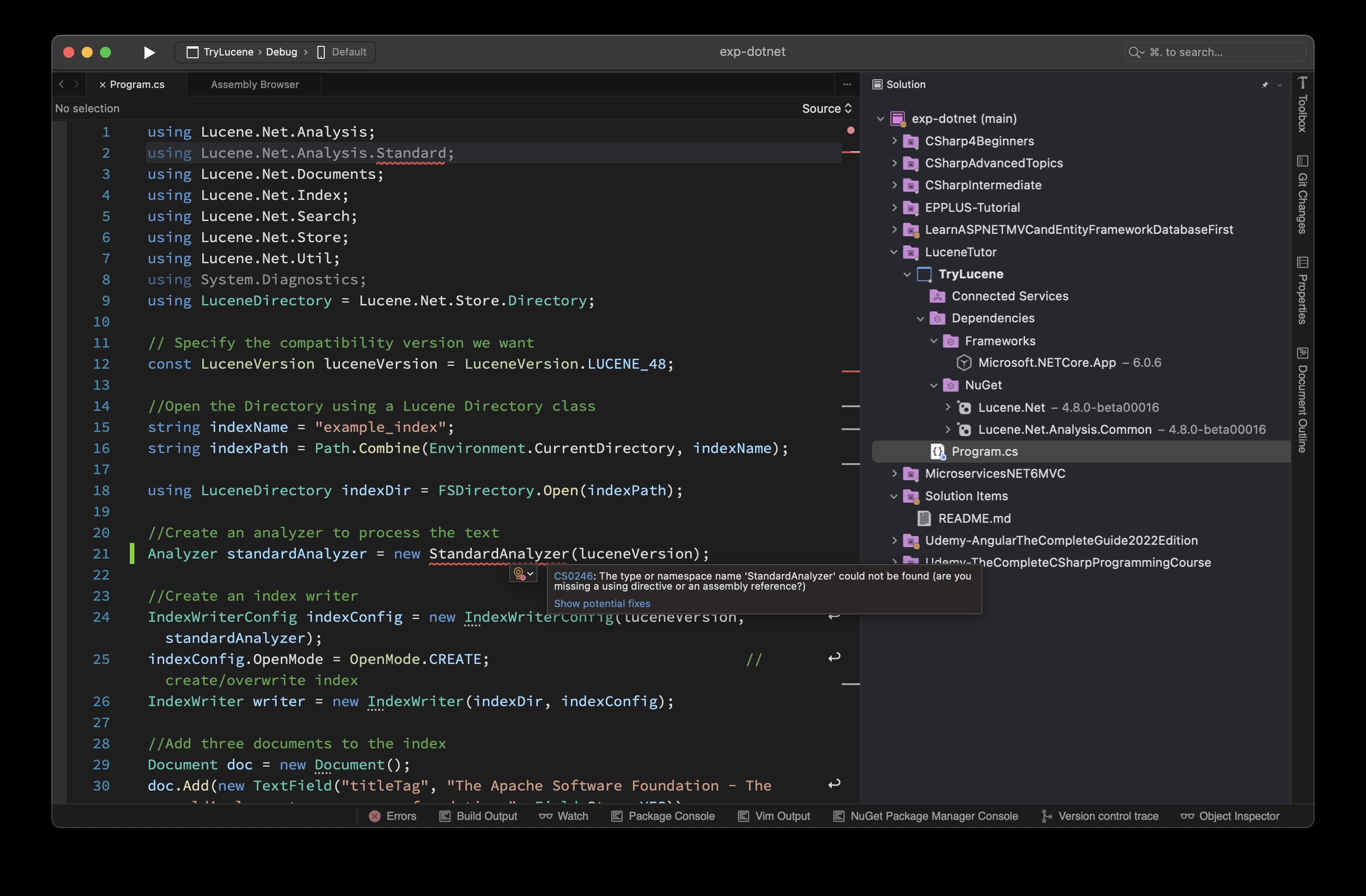 Hi, I followed the tutor installing the latest 4.8.0 beta Lucent. However, the code cannot pass compiling as shown below. The Assembly references to the wrong person of Lucene (3.0.3). I have tried remove the NuGet packages and reinstall again. It did not help. Any suggestion? Thanks!   -- This is an automated message from the Apache Git Service. To respond to the message, please log on to GitHub and use the URL above to go to the specific comment. To unsubscribe, e-mail: [email protected] For queries about this service, please contact Infrastructure at: [email protected]
