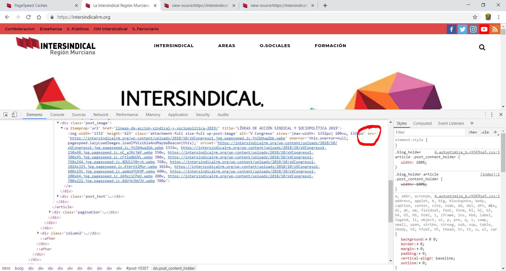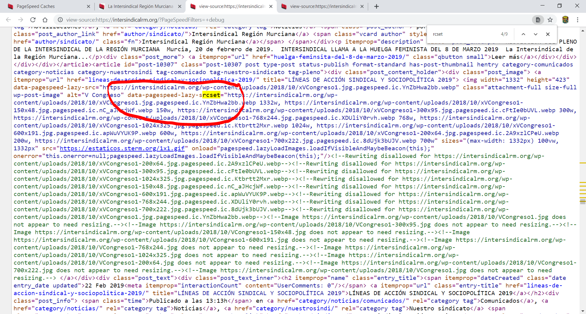 Lofesa edited a comment on issue #1864: lazyload_images does not work together with srcset URL: https://github.com/apache/incubator-pagespeed-mod/issues/1864#issuecomment-479576811 Hi I can confirm that. In html code all srcset are data-pagespeed-lazy-srcset, but when page load it get converted to srcset again. In the images it show the DOM elements and the html code of the last image in the page. Relevant lazyload config: CriticalImagesBeaconEnabled false; # Tried with true, no diff. pagespeed EnableFilters lazyload_images; pagespeed LazyloadImagesBlankUrl "https://estaticos.sterm.org/1x1.gif"; pagespeed LazyloadImagesAfterOnload off;