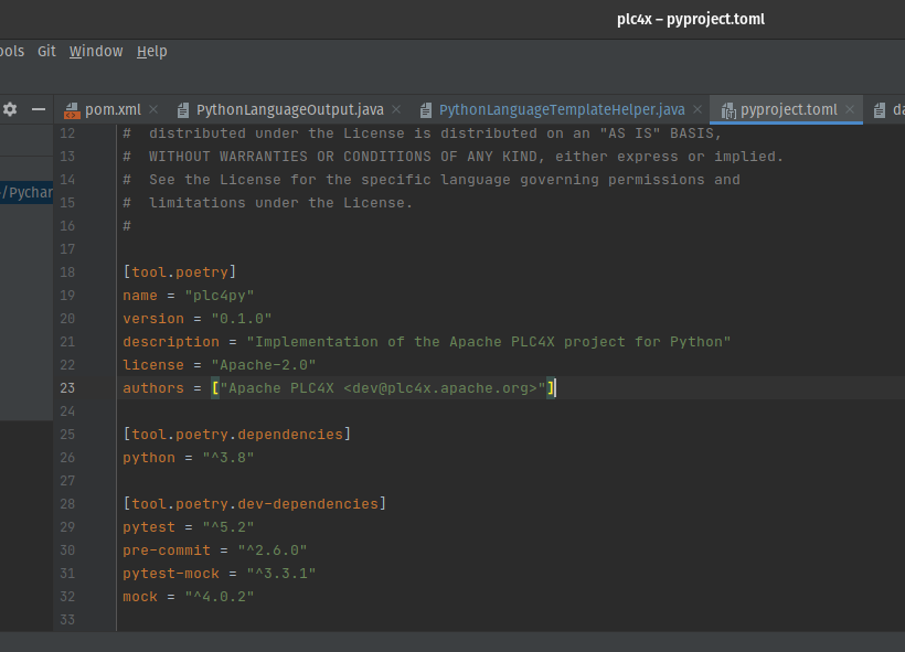 ########## File path: pyproject.toml ########## @@ -0,0 +1,14 @@ +[tool.poetry] +name = "plc4x" +version = "0.1.0" +description = "" +authors = ["ottlukas <[email protected]>"] Review comment: yes ... strange in PyCharm it looks like this:  But when I push to repo it does not...any ideas how to change this (seems to be IDE related) ---------------------------------------------------------------- This is an automated message from the Apache Git Service. To respond to the message, please log on to GitHub and use the URL above to go to the specific comment. For queries about this service, please contact Infrastructure at: [email protected]