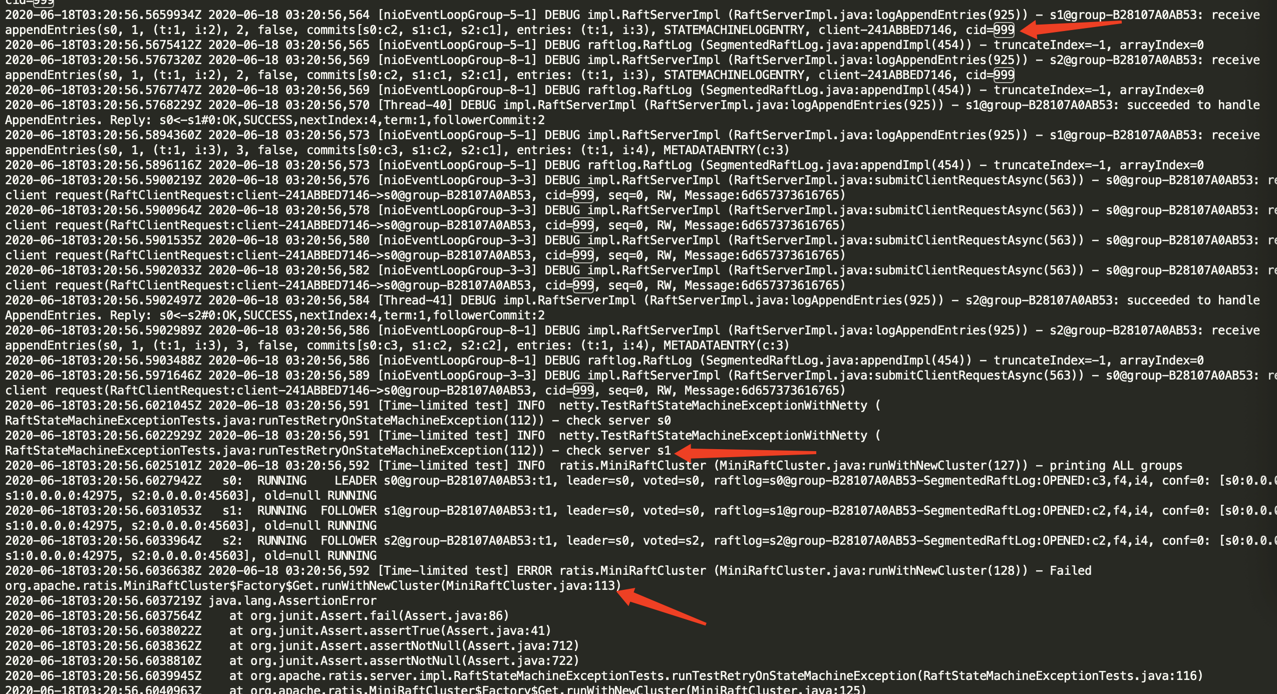 ## What changes were proposed in this pull request? What's the problem ? s1 received the request with callid: 999 at 2020-06-18 03:20:56,564, and after only 27ms i.e. 2020-06-18 03:20:56,591 unit test check the retry cache of s1 contain the request with callid: 999, so test failed.  How to fix ? Check many times whether the retry cache of s1 contain the request with callid: 999 ## What is the link to the Apache JIRA https://issues.apache.org/jira/browse/RATIS-895 ## How was this patch tested? Existed tests ---------------------------------------------------------------- This is an automated message from the Apache Git Service. To respond to the message, please log on to GitHub and use the URL above to go to the specific comment. For queries about this service, please contact Infrastructure at: [email protected]