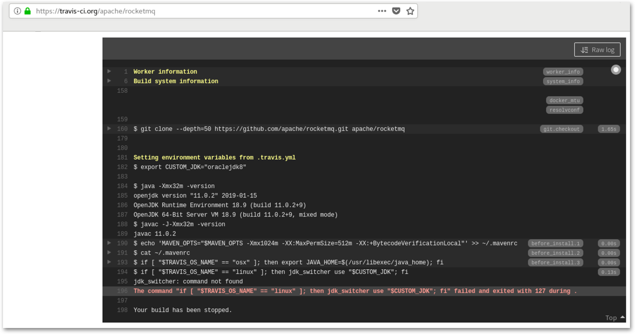 zihengCat opened a new pull request #1242: [FIX] Travis-CI Java 8 building environments URL: https://github.com/apache/rocketmq/pull/1242 ## What is the purpose of the change Fix Travis-CI `Java 8` building environments.  > Figure: bugs in `.travis.yml` ## Verifying this change Follow this checklist to help us incorporate your contribution quickly and easily. Notice, `it would be helpful if you could finish the following 5 checklist(the last one is not necessary)before request the community to review your PR`. - [x] Make sure there is a [Github issue](https://github.com/apache/rocketmq/issues) filed for the change (usually before you start working on it). Trivial changes like typos do not require a Github issue. Your pull request should address just this issue, without pulling in other changes - one PR resolves one issue. - [x] Format the pull request title like `[ISSUE #123] Fix UnknownException when host config not exist`. Each commit in the pull request should have a meaningful subject line and body. - [x] Write a pull request description that is detailed enough to understand what the pull request does, how, and why. - [x] Write necessary unit-test(over 80% coverage) to verify your logic correction, more mock a little better when cross module dependency exist. If the new feature or significant change is committed, please remember to add integration-test in [test module](https://github.com/apache/rocketmq/tree/master/test). - [x] Run `mvn -B clean apache-rat:check findbugs:findbugs checkstyle:checkstyle` to make sure basic checks pass. Run `mvn clean install -DskipITs` to make sure unit-test pass. Run `mvn clean test-compile failsafe:integration-test` to make sure integration-test pass. - [x] If this contribution is large, please file an [Apache Individual Contributor License Agreement](http://www.apache.org/licenses/#clas).