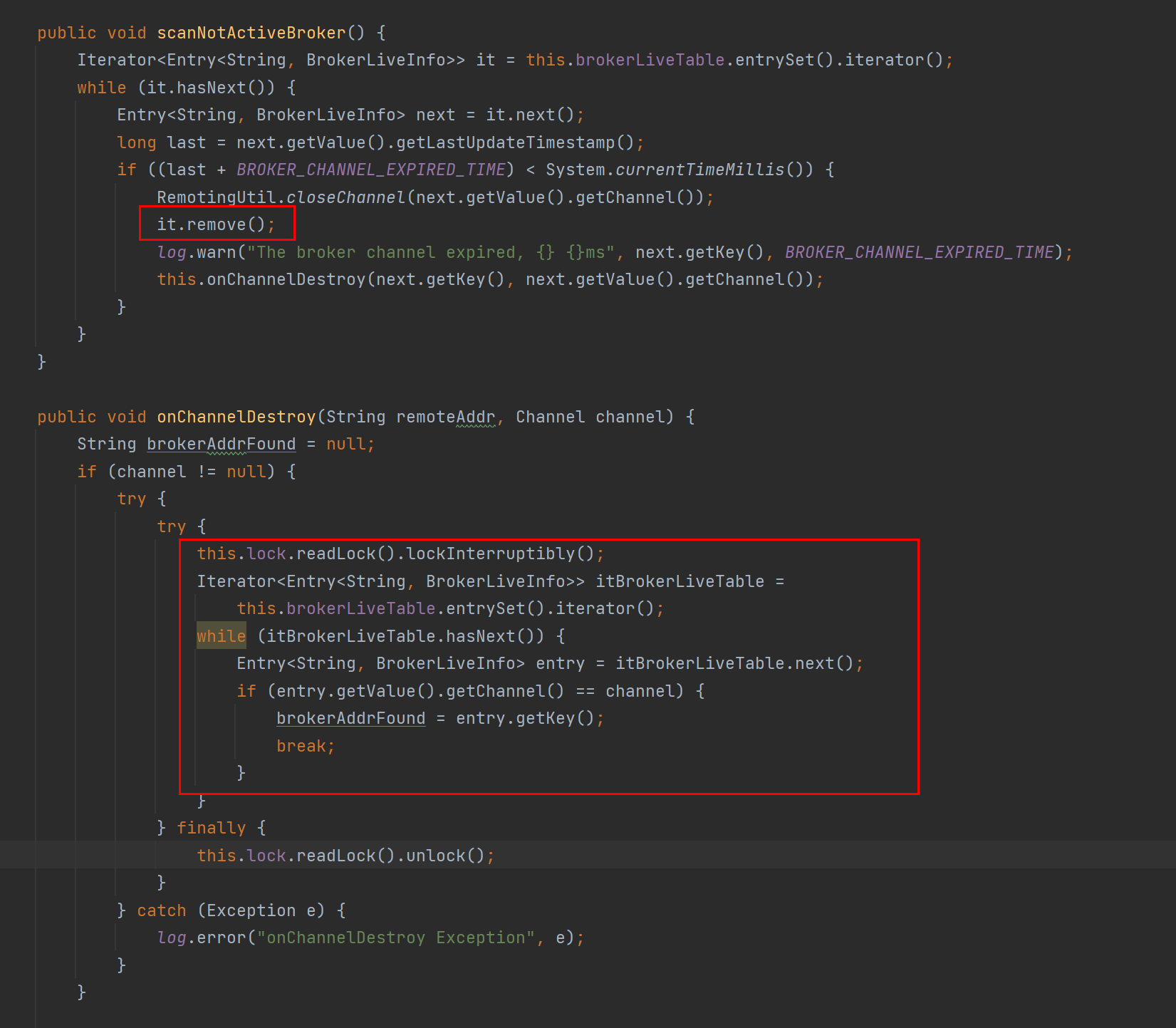 In the scanNotActiveBroker(), the inactive broker record was removed in the brokerLiveTable, then call onChannelDestroy(). **But in the onChannelDestroy(), it re-get the brokerAddr according to the channel,** and it confused me. Can anyone explain me why it do this -- This is an automated message from the Apache Git Service. To respond to the message, please log on to GitHub and use the URL above to go to the specific comment. To unsubscribe, e-mail: [email protected] For queries about this service, please contact Infrastructure at: [email protected]