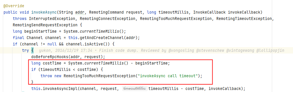 RemotingTooMuchRequestException("invokeAsync call timeout") is thrown directly