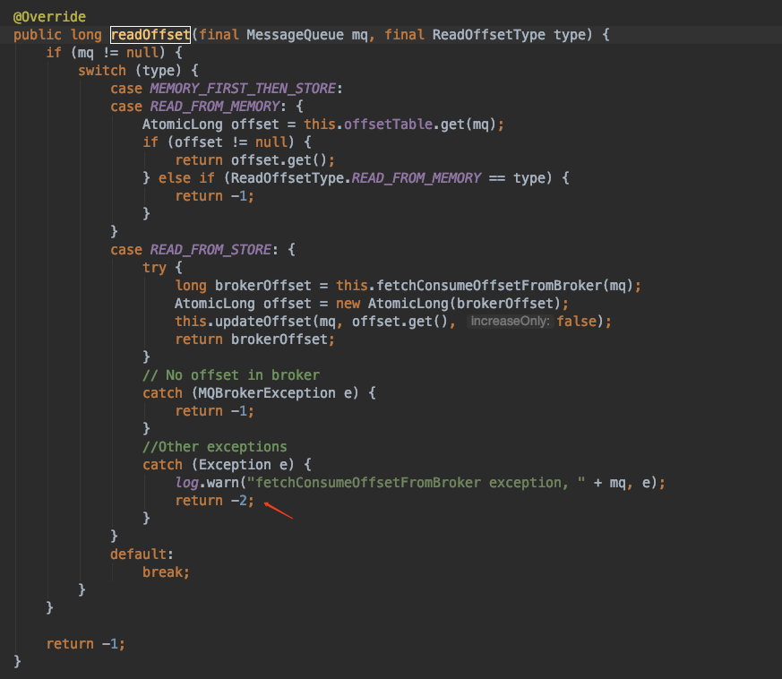 我也查看了你说的这两个pr,但是我和楼主一样发现了当RemoteBrokerOffsetStore#readOffset时就出现了exception,会被默认设置为-2,外层offset则会等于-1