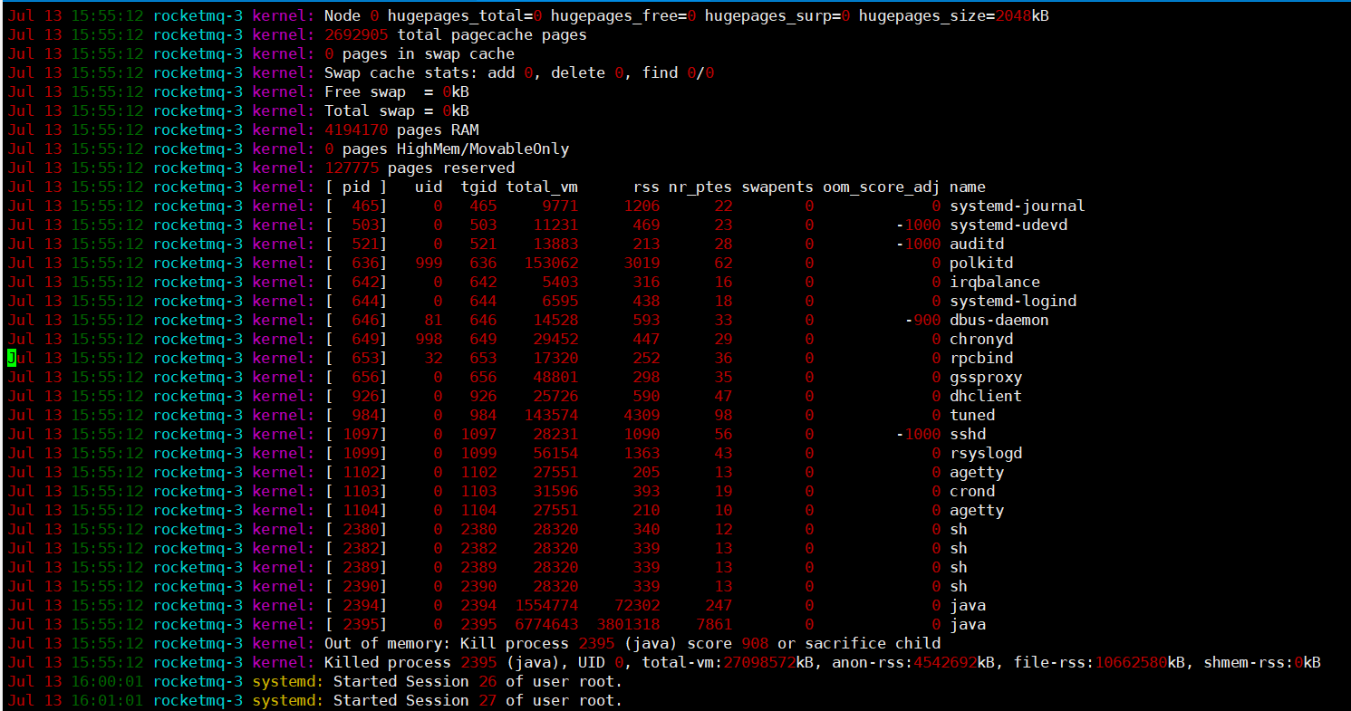 OS:3.10.0-1127.el7.x86_64 CentOS Linux release 7.8.2003 (Core) 8C 16G swapoff rocketmq version:V4_3_1 2 master 2slave async mode check /var/log/message error:Jul 13 15:55:12 rocketmq-3 kernel: Out of memory: Kill process 2395 (java) score 908 or sacrifice child   -- This is an automated message from the Apache Git Service. To respond to the message, please log on to GitHub and use the URL above to go to the specific comment. To unsubscribe, e-mail: [email protected] For queries about this service, please contact Infrastructure at: [email protected]