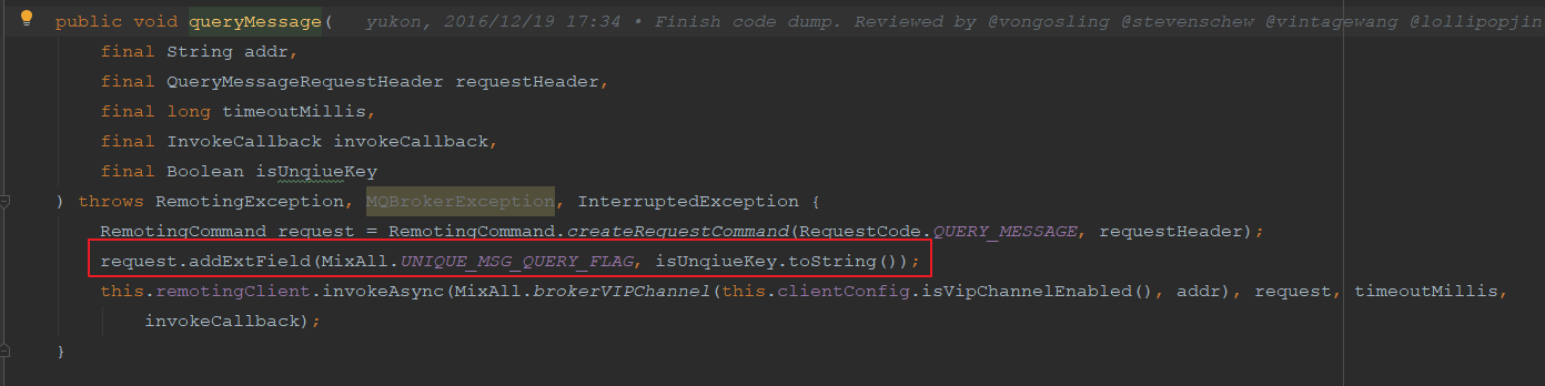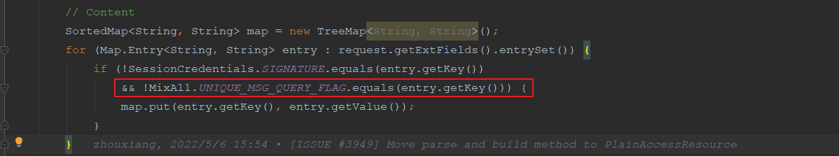 Before this patch (https://github.com/apache/rocketmq/commit/a4a53706329f8b26650978bcd6319dbffd7bb4ed) ,The additional attribute UNIQUE_MSG_QUERY_FLAG is added to the request extField when the message is queried, which causes inconsistency when the signature is computed between the client and the server,so the property is removed when the server computes signature. Now this line code could be removed, I will fix it later.  -- This is an automated message from the Apache Git Service. To respond to the message, please log on to GitHub and use the URL above to go to the specific comment. To unsubscribe, e-mail: [email protected] For queries about this service, please contact Infrastructure at: [email protected]