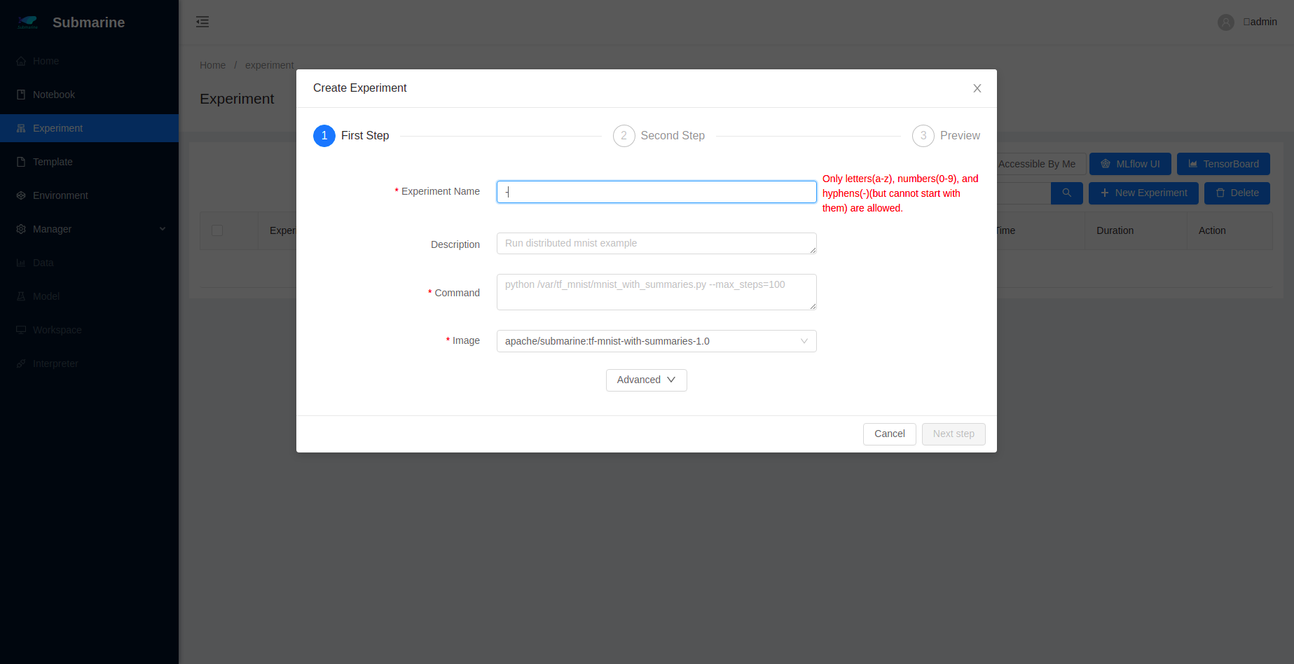 Open the workbench and type invalid experiment name.