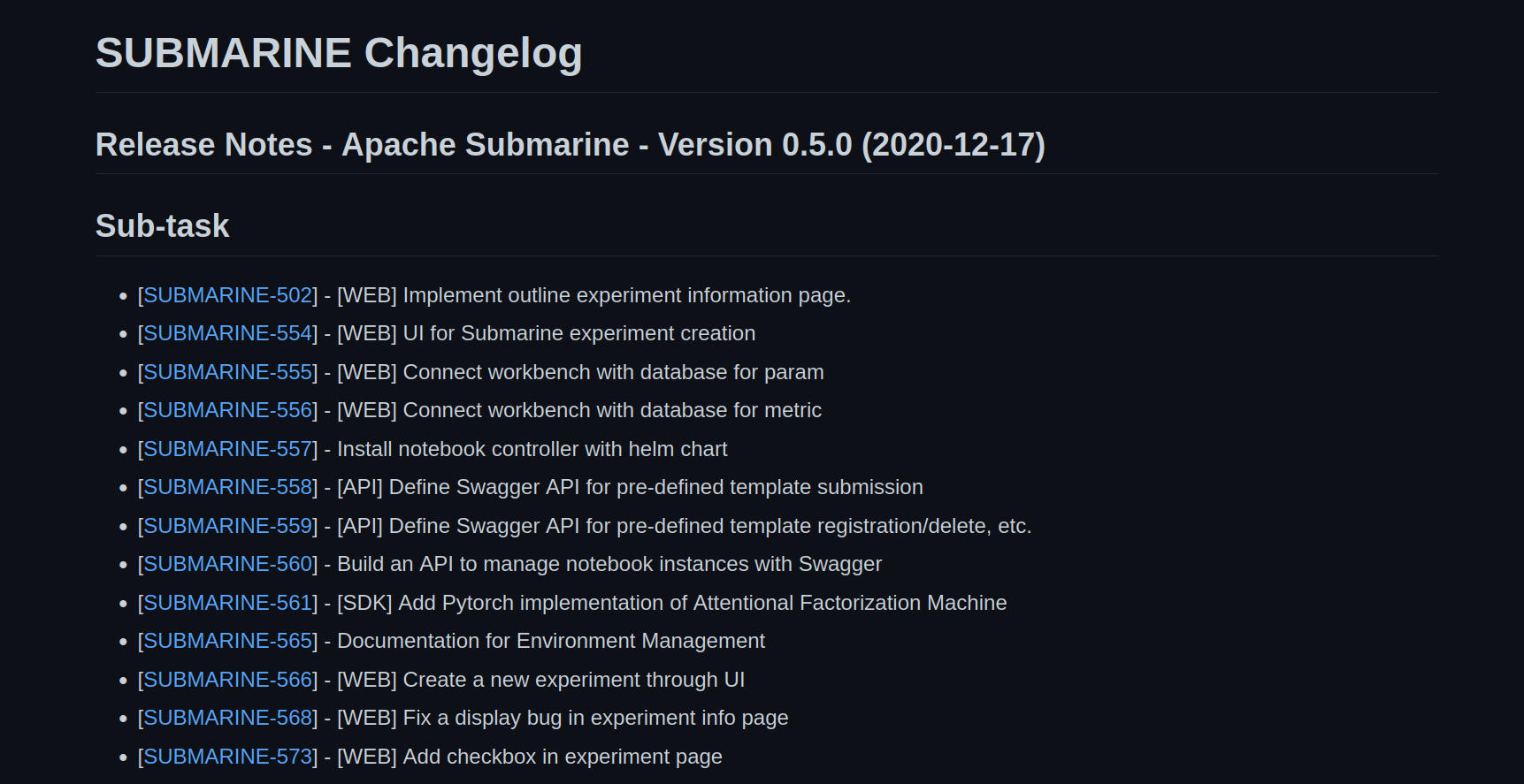 +## Release Notes - Apache Submarine - Version 0.5.0 (2020-12-17)