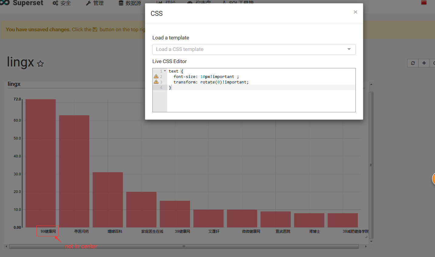 luciuschina opened a new issue #3206: How to set the fonts on the X axis no rotate and in center URL: https://github.com/apache/incubator-superset/issues/3206 Make sure these boxes are checked before submitting your issue - thank you! - [X] I have checked the superset logs for python stacktraces and included it here as text if any - [X] I have reproduced the issue with at least the latest released version of superset - [X] I have checked the issue tracker for the same issue and I haven't found one similar ### Superset version 0.18.5 ### Expected results Set the fonts in the dist_bar no rotate and in center ### Actual results I can set the fonts in the dist_bar no rotate, but the fonts **not in center** ### Steps to reproduce I use the CSS template to change the style,and add _text { transform: rotate(0)!important; }_ can dispaly the fonts horizontal. but the fonts not in center. I have tested many CSS styles, but it doesn't work ! Who can help me, very appreciated. [2](https://user-images.githubusercontent.com/16470564/28772064-9d158c5e-7617-11e7-9651-82aa759432b7.png) ---------------------------------------------------------------- This is an automated message from the Apache Git Service. To respond to the message, please log on GitHub and use the URL above to go to the specific comment. For queries about this service, please contact Infrastructure at: [email protected]