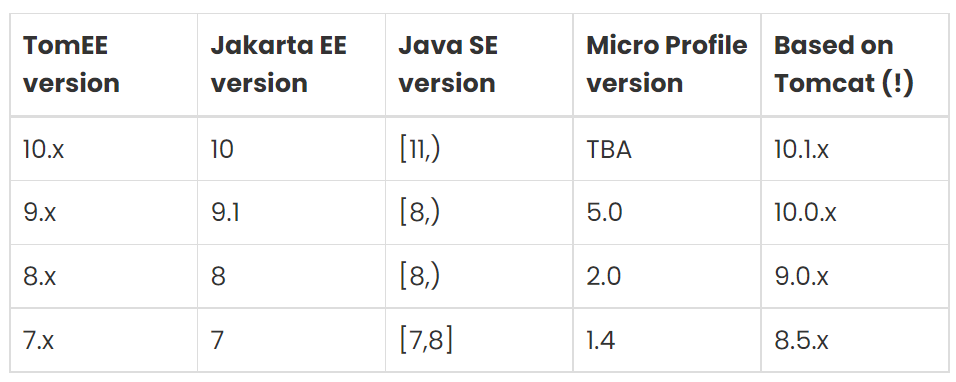 Thank you for your feedback, i removed 'release column' to ease maintenance. i also believe we can't put all specs versions in columns as it takes too much width. some remarks : i find that table without specs to be a bit useless because tomee follows jakarta ee numbering since v7 :  so i thought some specs could be usefull. i selected them based on what can help my students configure TomEE and Eclipse :  the table you are suggesting is actually my table "C", sorry if i wasnt clear :  -- This is an automated message from the Apache Git Service. To respond to the message, please log on to GitHub and use the URL above to go to the specific comment. To unsubscribe, e-mail: [email protected] For queries about this service, please contact Infrastructure at: [email protected]