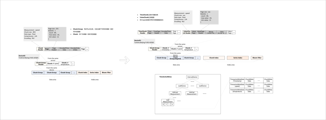 Tian Jiang ---- Replied Message ---- | From | hongzhigao<[email protected]> | | Date | 11/6/2024 19:05 | | To | tsfile-dev<[email protected]> | | Subject | Follow-up: Aligned Time Series Design for TsFile-CPP | Diagram of TsFile Aligned Time Series?? https://i.postimg.cc/PJXXdB3V/Ts-File-Aligned-TS.png Aligned time series in TsFile introduces several key features to improve the organization and retrieval of timestamp-aligned data: 1. TimeChunk in ChunkGroup: Each ChunkGroup now includes a dedicated Chunk of Timestamp (TimeChunk) that records all timestamps corresponding to that ChunkGroup. Additionally, each Page within a ValueChunk now contains a BitMap to indicate the presence or absence of data for specific timestamps. This allows for precise alignment of data points across different series. 2. Timestamp TimeseriesIndex in ChunkIndex Area: A new index for all TimeChunks, known as the TimeseriesIndex of Timestamp, has been added in the ChunkIndex section. Its TimeseriesMetaData has an empty name field (""). This index enhances direct access to timestamp-related information. 3. Timestamp SeriesIndex in SeriesIndex Area: A corresponding index for the TimeseriesIndex of Timestamp is also added in the SeriesIndex area, stored at the leftmost node of the device-sensor tree. This provides a quick path for locating time-related data. These additions improve timestamp alignment and retrieval efficiency in TsFile, significantly reducing storage space. ------------------ ???????? ------------------ ??????: "hongzhigao" <[email protected]>; ????????: 2024??11??6??(??????) ????4:43 ??????: "tsfile-dev"<[email protected]>; ????: ?????? Request for Consideration as Apache TsFile Committer Attached is an overview diagram of the TsFileV4 file format. The link is as follows. https://i.postimg.cc/mr1hqfJQ/Tsfile-V4-overview.png TsFile V4 introduces the TableModel, along with additional components in the index section, namely TableIndexNode, TableSchema, and PropertiesMap. These components enhance data organization, accessibility, and file-level configuration. TableIndexNode: This component links a TableName to the root node of devices within the index tree structure. During data reading, the system first locates the root node by TableName and then recursively traverses down to reach the LeafMeasurement. This enables efficient access to specific measurement data within complex hierarchical structures. TableSchema: The TableSchema associates a TableName with the metadata of sensor data. It acts as a schema reference, defining data structure and sensor-related details necessary for interpreting the stored data. PropertiesMap: The PropertiesMap is designed for setting file-level properties, such as encryption configurations, allowing for flexible adjustments to security and other properties as needed across files. For the PropertiesMap, it should be noted that the encoding and compression settings for the time column are expected to be stored here. Currently, these configurations can be modified, but TsFile itself does not include this information, which poses some risk. These additions in TsFile v4 aim to improve data manageability and extensibility, making TsFile more robust for handling varied data structures and configurations. I will provide additional details on some other features, such as AlignedTimeSeries, new data types like String, Blob, TimeStamp, and Date, in follow-up emails. ------------------ ???????? ------------------ ??????: "dev" <[email protected]>; ????????: 2024??10??15??(??????) ????11:45 ??????: "dev"<[email protected]>; ????: Re: Request for Consideration as Apache TsFile Committer Hi Hongzhi, Welcome to TsFile community and thanks for your contribution! C++ TsFile will greatly expand our end-side scenarios. Looking forward to your emails about the detailed design of C++ TsFile V4 and other features :-) Jialin Qiao > From: "Tian Jiang"<[email protected]> > Date: Tue, Oct 15, 2024, 10:17 > Subject: Re: Request for Consideration as Apache TsFile Committer > To: "[email protected]"<[email protected]> > Hi Hongzhi, > > > Thanks for your active contributions for the Apache TsFile community, which are very helpful improving this project. > > > I personally think your work is quite enough regarding the standard of becoming a committer, and the Apache TsFile community > does need some new committers. We may soon start the nomination and voting process. > > > Looking forward to seeing your future activities in this project. > > > Best, > Tian Jiang > > > ---- Replied Message ---- > | From | hongzhigao<[email protected]> | > | Date | 10/14/2024 15:29 | > | To | tsfile-dev<[email protected]> | > | Subject | Request for Consideration as Apache TsFile Committer | > Hi all, > > > I would like to express my interest in becoming a committer for the Apache TsFile project. I have been actively contributing to the project, and I am eager to take on more responsibility within the community. > > > A brief introduction: I hold a master's degree from Zhejiang University and have experience in storage system development from my time at Tencent Cloud Storage R&amp;D Center. I hope to apply this experience to further improve and enhance TsFile. > > > > > > > Here is a summary of my recent contributions to the C++ version of TsFile: > > Test Coverage Completion: I completed the test suite for TsFile, covering essential components such as core data structures, encoding/decoding mechanisms, and the data writing process.(feature/unittests) > > Bug Fixes and Stability Enhancements: During unit testing, I identified and resolved several code vulnerabilities, significantly improving the stability of the system. > > Consistency with Java Version: I ensured that the C++ encoding/decoding algorithms are consistent with the Java version, maintaining cross-language compatibility. > > Aligned Time Series Implementation: I also successfully implemented aligned time series functionality, a key feature for efficient data o
