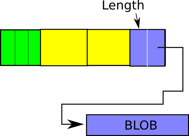 Nothing that special. It’s a fixed sized buffer, Field objects reference into it, you read out of it and write the values into your engine. However, when you get to BLOBs, we can’t use a fixed sized buffer as BLOBs may be quite large. So, the format with BLOBS is the bit in the row is a length of the blob (1, 2, 3 or 4 bytes – in Drizzle it’s only 3 or 4 bytes now and soon only 4 bytes once we fix a bug that isn’t interesting to discuss here). The Second part of the in-row part is a pointer to a location in memory where the BLOB is stored. So a row that has a BLOB in it looks something like this: