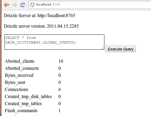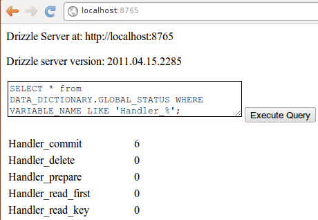But that wasn’t nearly enough… I also wanted to be able to issue arbitrary queries. Thanks to the supporting code we have in the Drizzle server for EXECUTE() (also used by the replication slave), this was also pretty easy. I created a way to execute the content of a HTTP POST request as if you had done so with EXECUTE() – all nicely wrapped in a transaction.